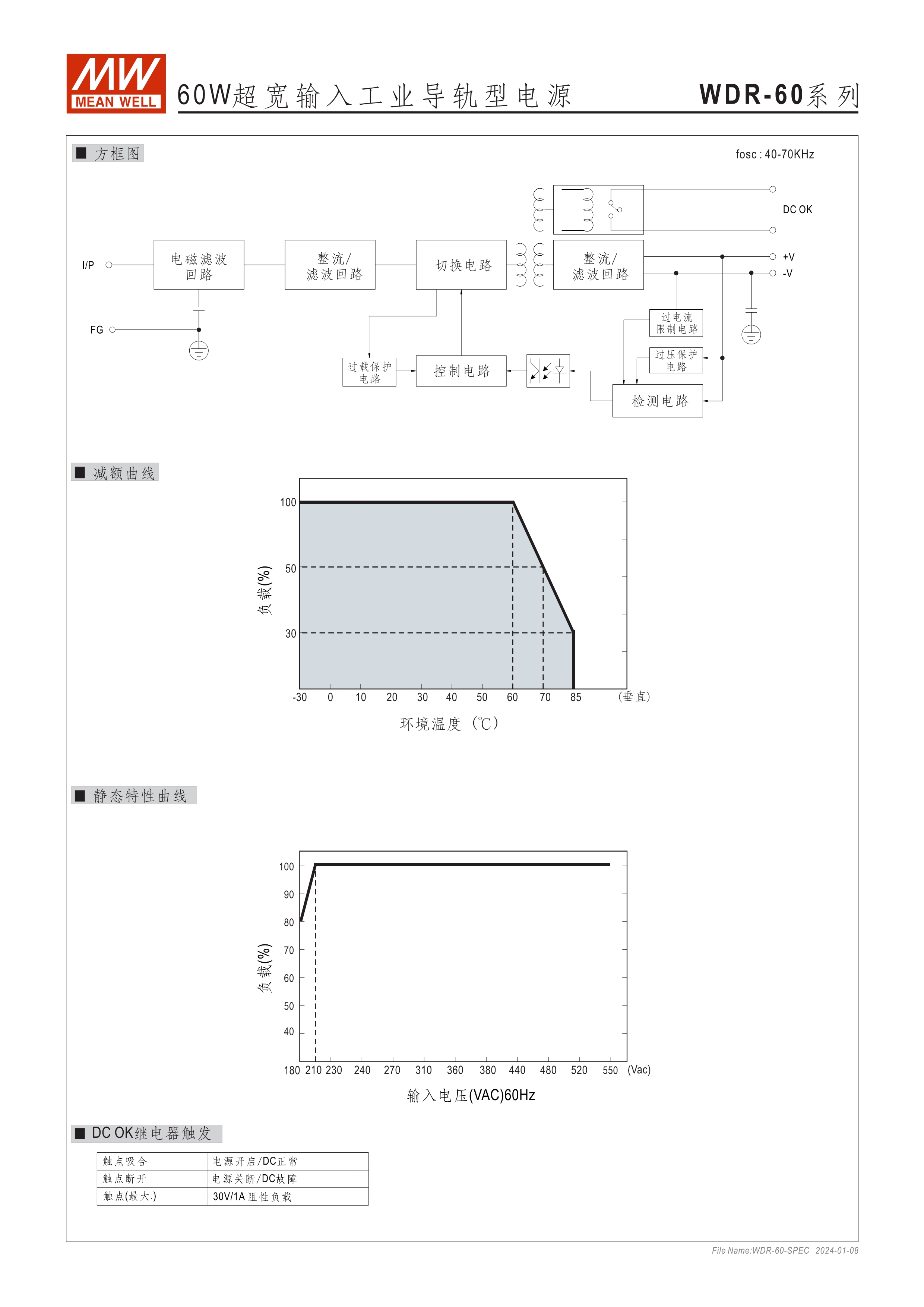 金屬殼,薄型設(shè)計 單相及雙相, 180~550VAC寬輸入范圍 高工作效率達93% 240W及480W內(nèi)建主動式功率因子矯正功能(active PFC) 適合安裝于DIN rail TS-35 / 7.5 或 15 內(nèi)建DC OK繼電器接點(Relay contact)