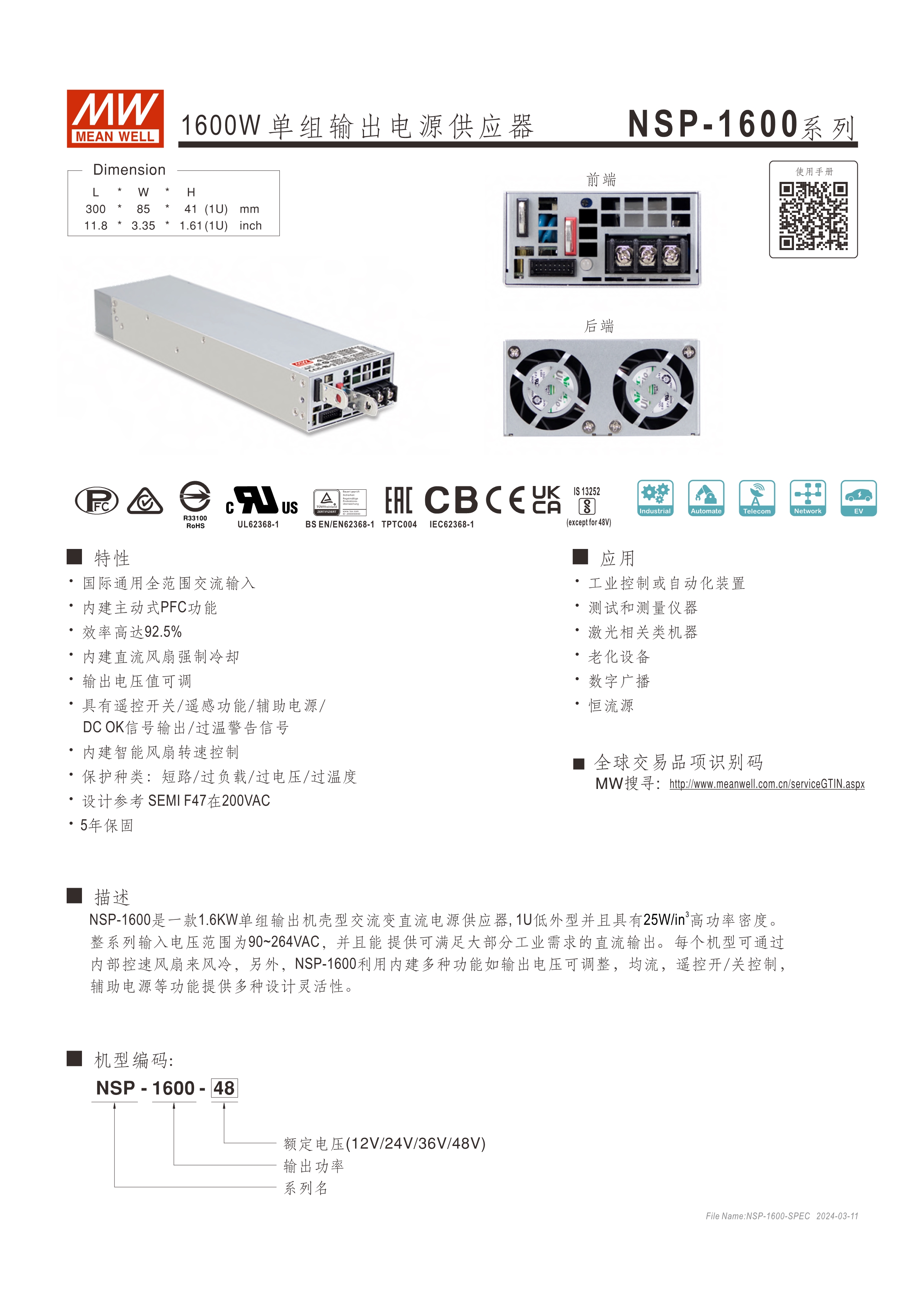 電氣規(guī)格及安規(guī)認(rèn)證皆參照RSP或DPU系列,客戶可直接選用取代,立即導(dǎo)入使用 環(huán)境友善制程與用料 全范圍電壓輸入 效率最高可達94.5% 內(nèi)建PV功能 設(shè)計符合SEMI F47 @200Vac