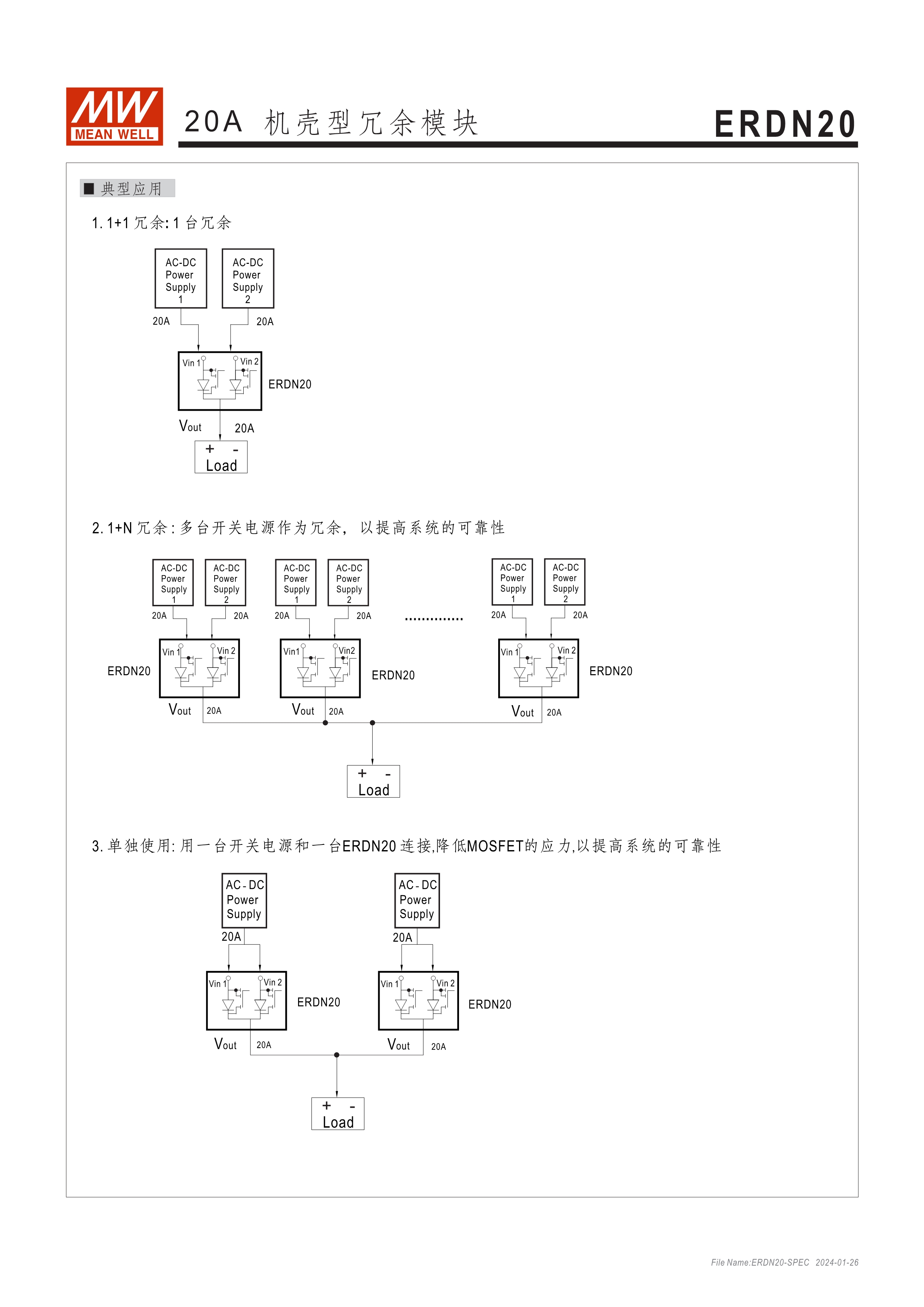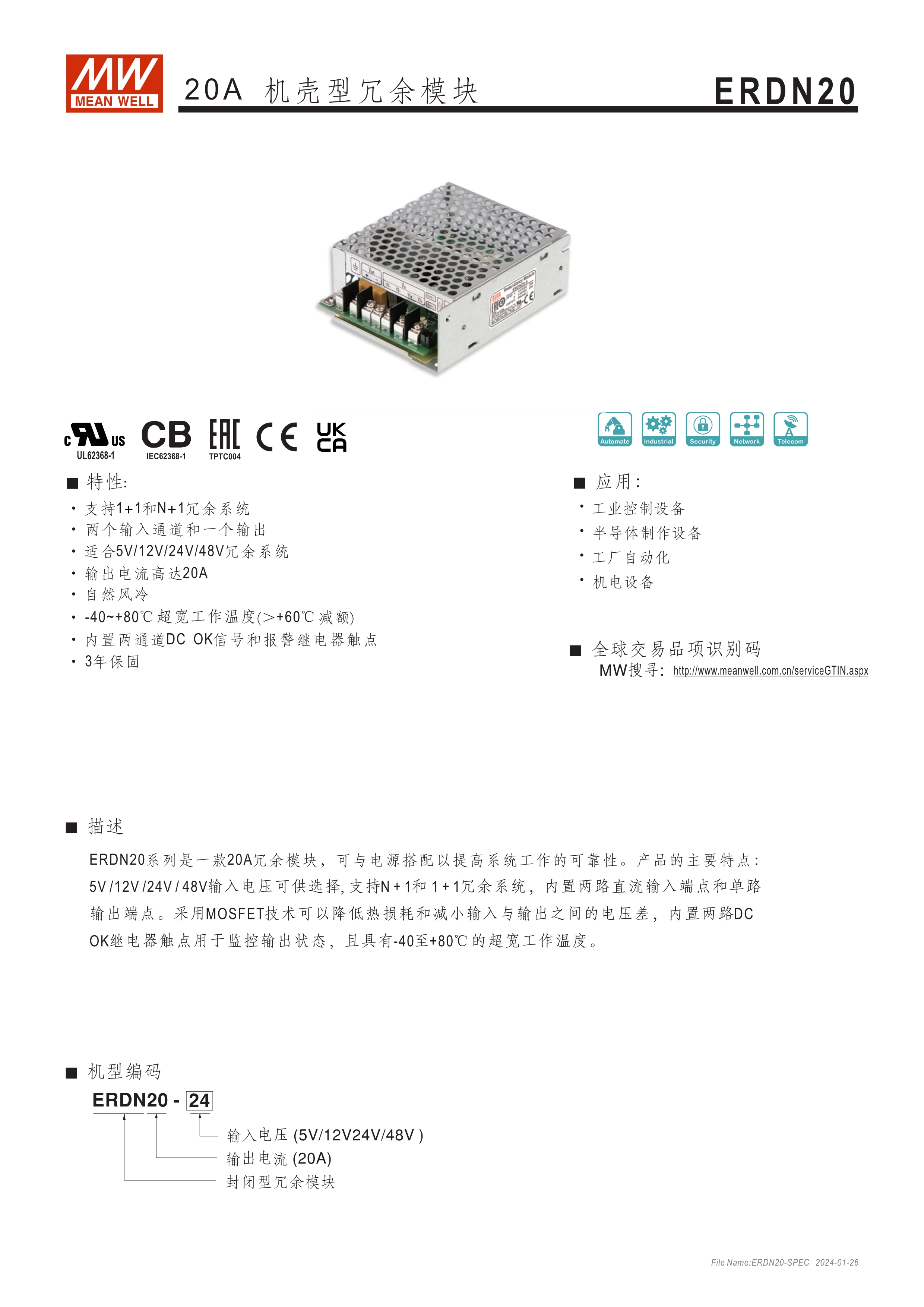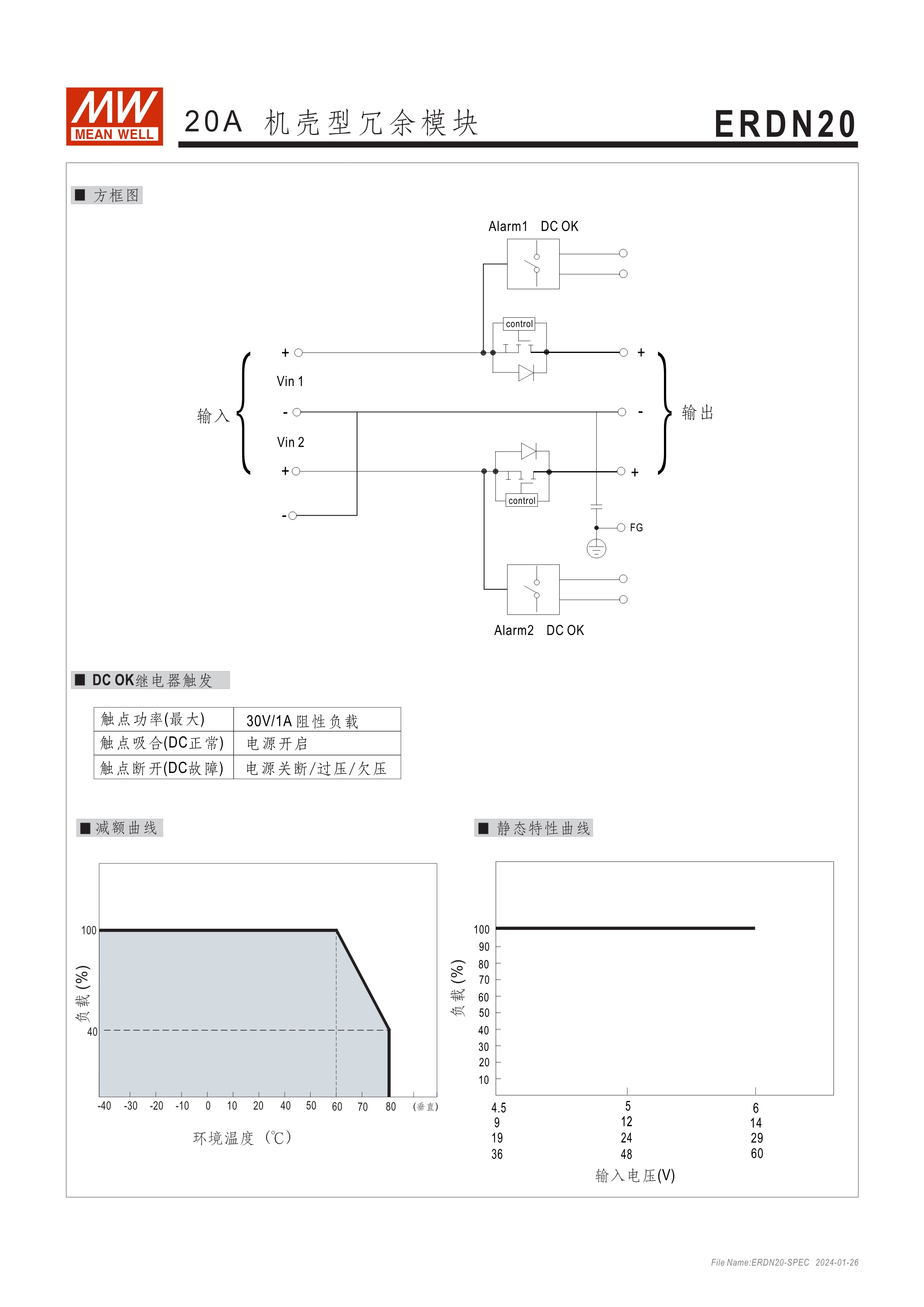 20A/40A 電源供應(yīng)器冗余模塊 可支持系統(tǒng)1+1及1+N冗余 二路DC輸入接點(diǎn)與單路輸出 內(nèi)建二路DC OK繼電器接點(diǎn)可偵測電源狀態(tài)