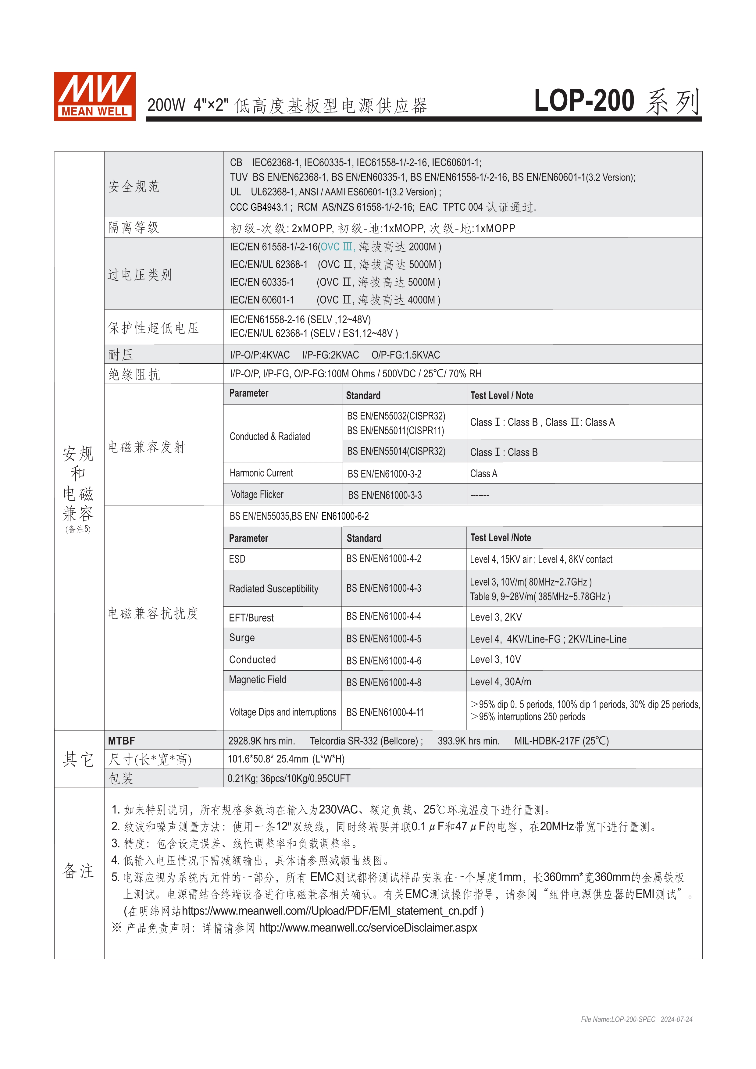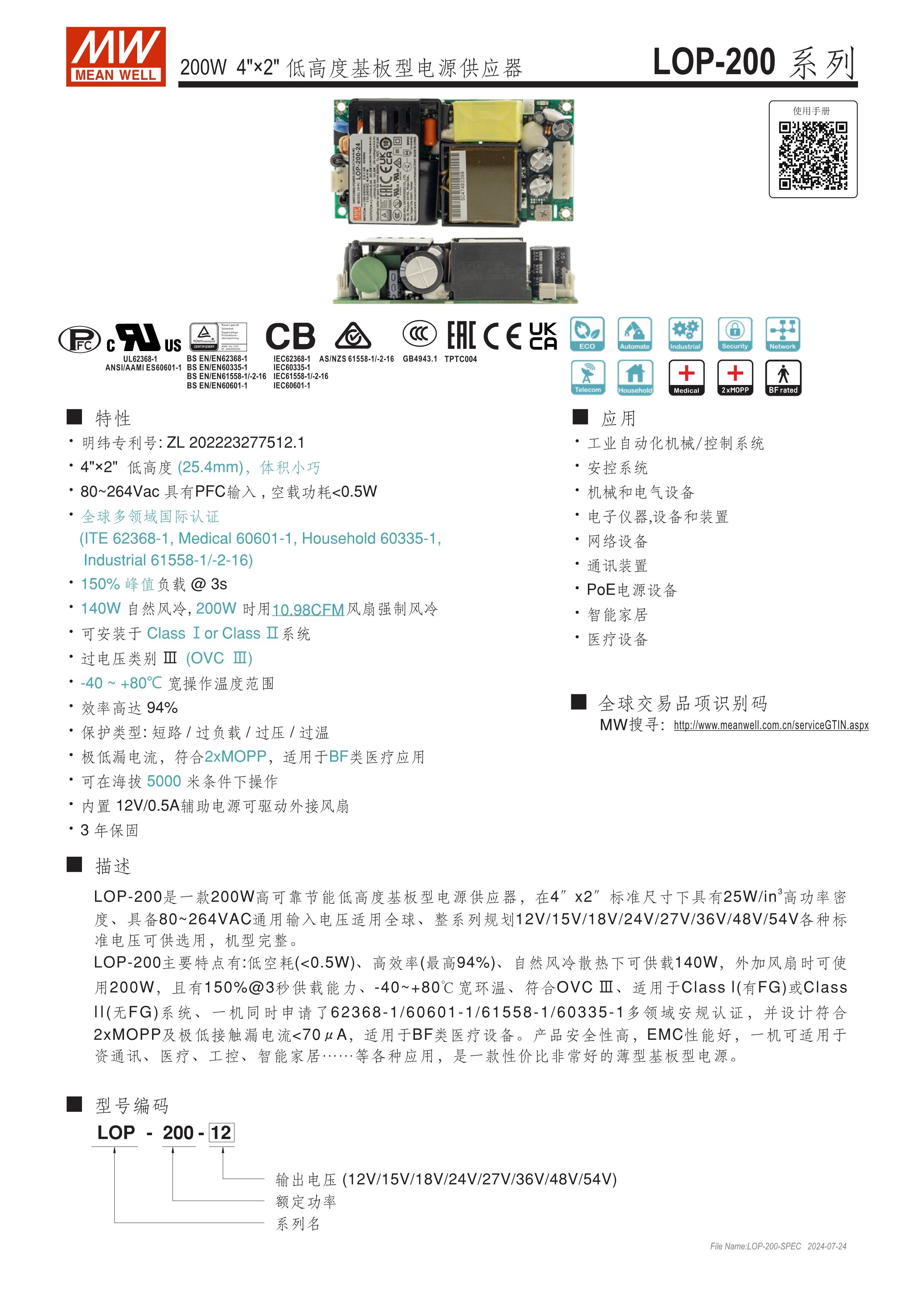 明緯專利號:ZL 202223277512.1 4"x2" 和 5"x3" 低高度小巧外型 (25.4mm~33.5mm) 全球安規(guī)多領域認證 (資通訊62368-1, 醫(yī)療60601-1, 家用60335-1, 工業(yè)用61558-1/-2-16) 150%峰值負載@3秒 符合Class I或Class II 過電壓類別III (OVC III) -40℃ ~ +80℃寬操作溫度範圍