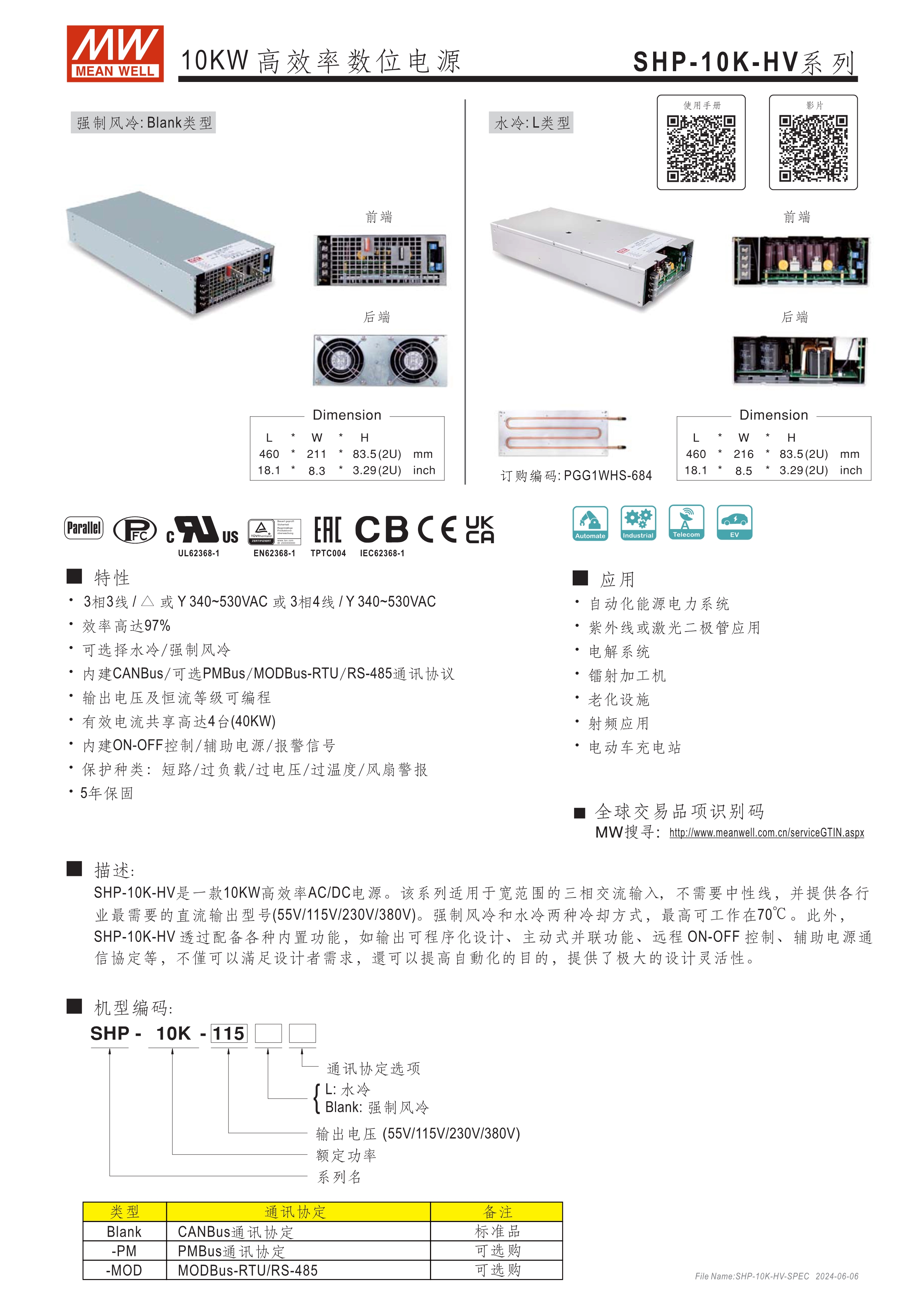 三相三線無中性線/340~530VAC寬輸入范圍 可選擇水冷/強制風(fēng)冷 內(nèi)建CANBus/可選PMBus通訊協(xié)議/MODBus-RTU/RS-485 輸出電壓及恒流等級可編程 有效電流共享高達4臺 內(nèi)建ONOFF控制/輔助電源/報警信號 5年保固