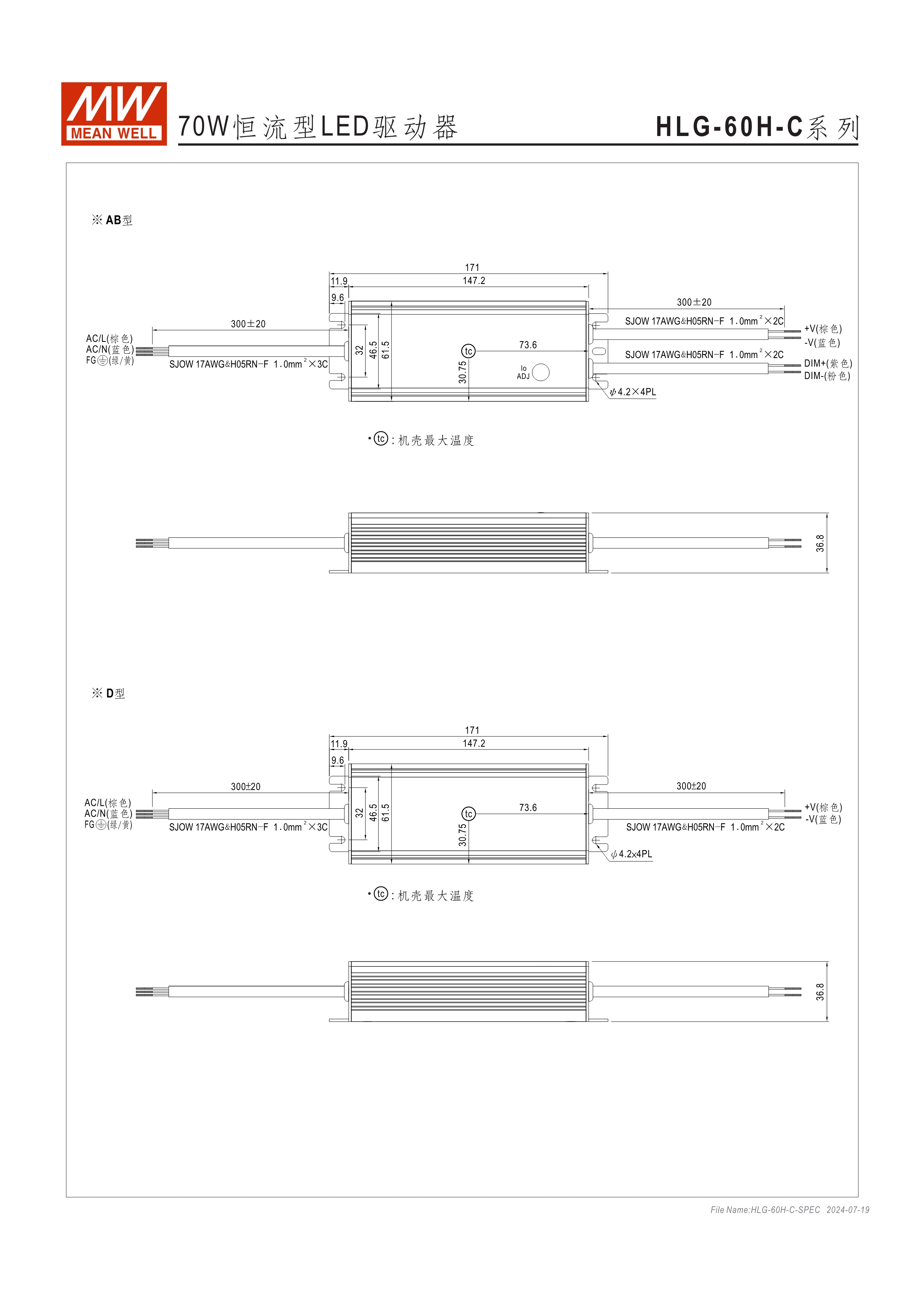 90~305VAC交流輸入,內(nèi)建主動式功率因子矯正功能(active PFC) 高壓(大于60VDC)恒流輸出機種 金屬外殼,IP67/IP65防護等級可用于戶外與室內(nèi) 功能選項 : 輸出可經(jīng)由電位器調(diào)整;三合一調(diào)光(1~10Vdc或10V PWM信號或電阻);定時調(diào)光;智能定時調(diào)光 Type "HL" LED電源適用在安裝于Class I, Division 2 類 危險地點之照明燈具 (僅HLG-240H-C/320H-C) 適合于LED路燈及戶外LED照明等應(yīng)用 7年保固期