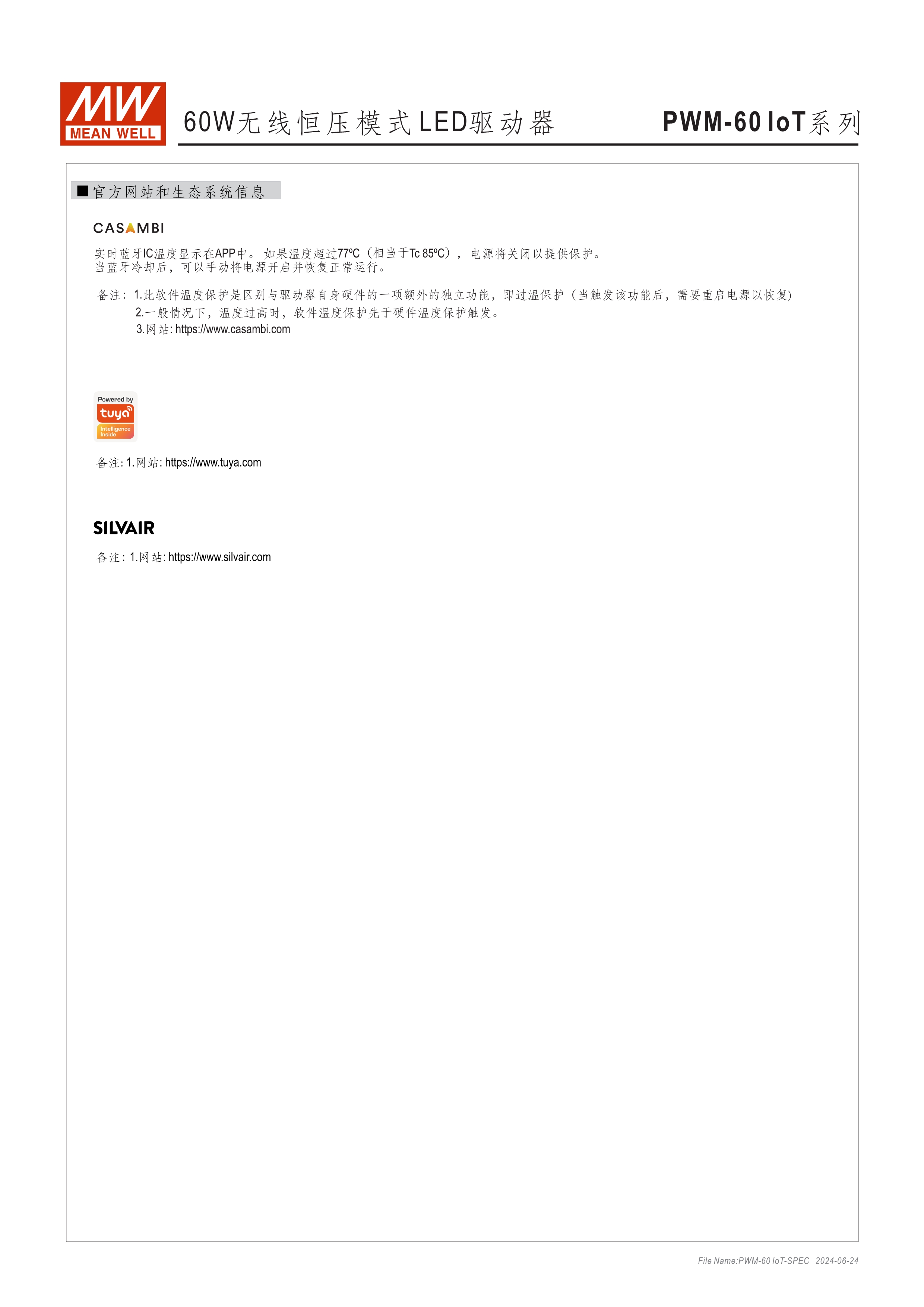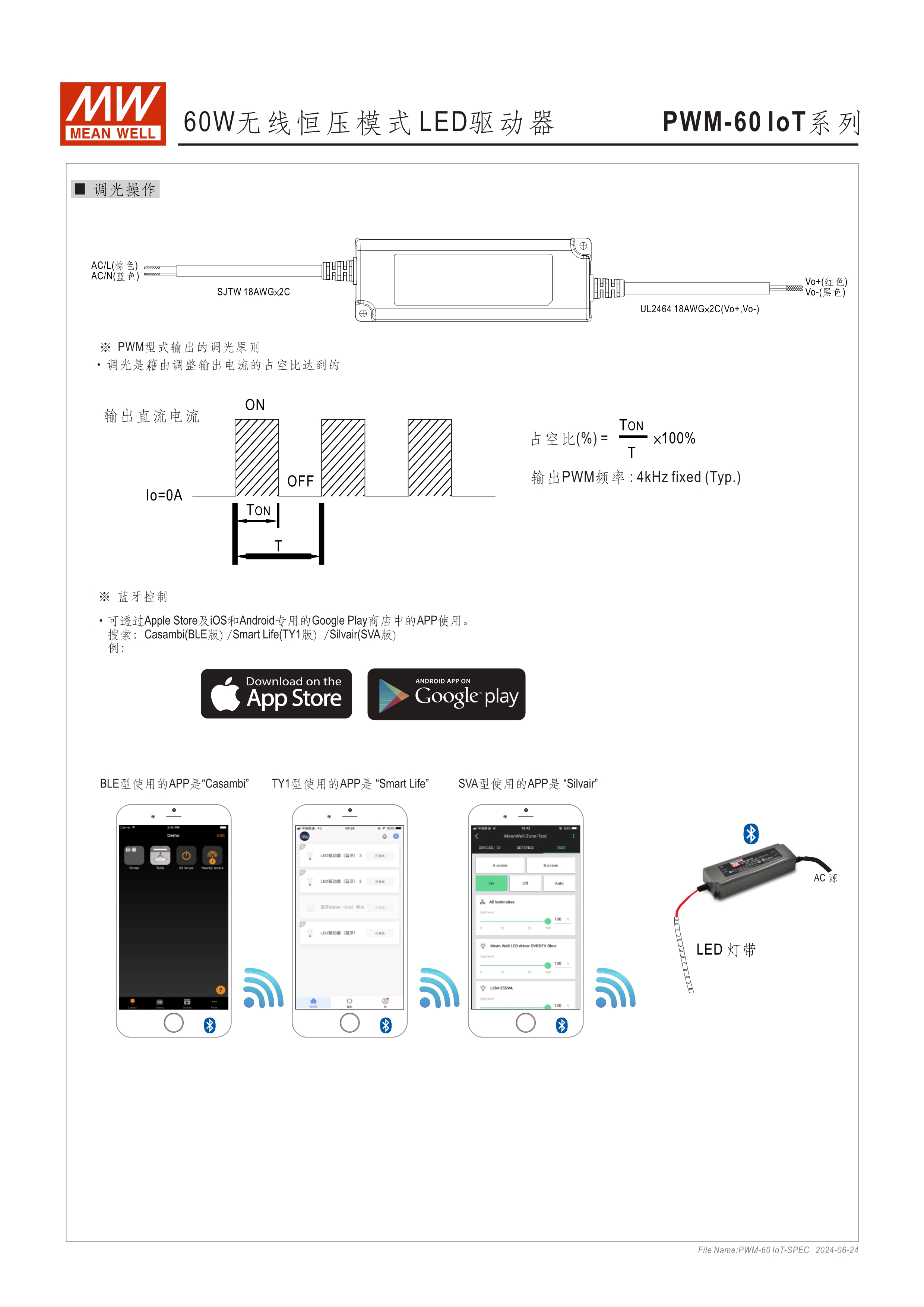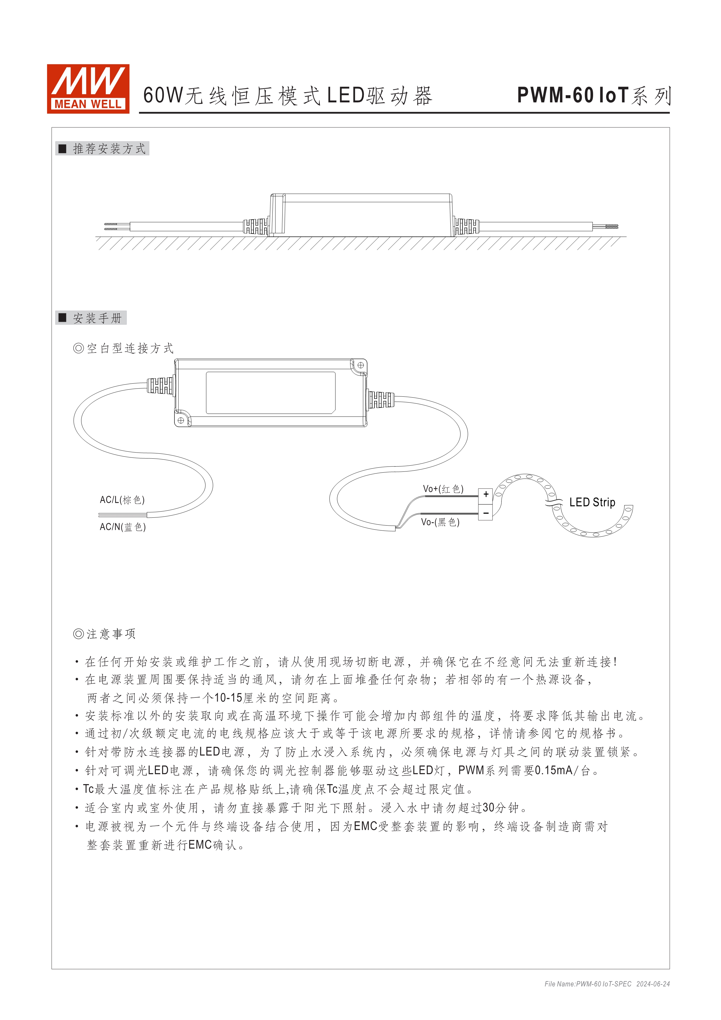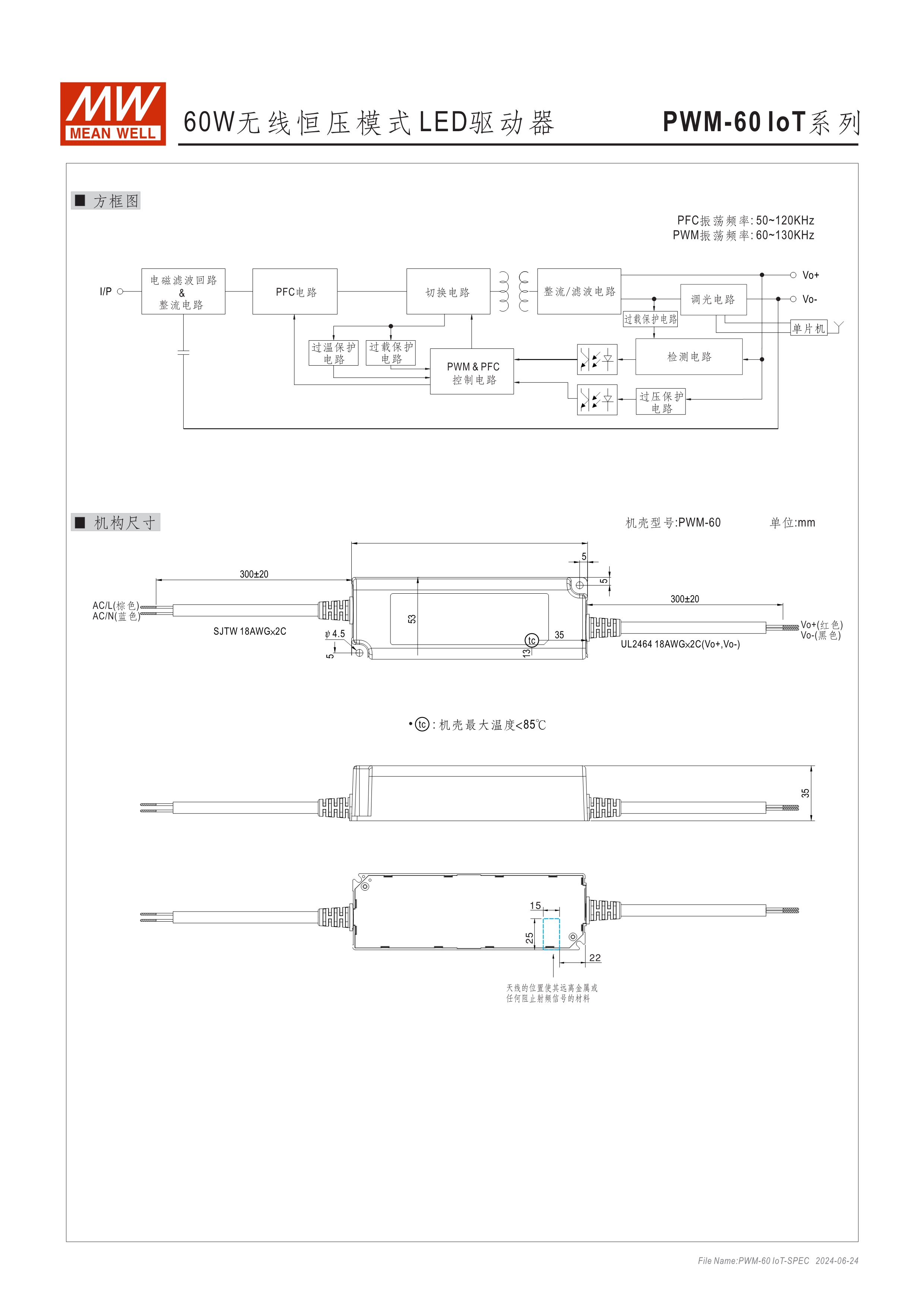恒壓輸出模式多種可選 (PWM系列) 無頻閃設(shè)計 塑料外殼及符合Class II無地線設(shè)計 主動式PFC設(shè)計 雷擊保護耐壓設(shè)計2KV(L-N) 保護功能:短路、過電壓、過溫度