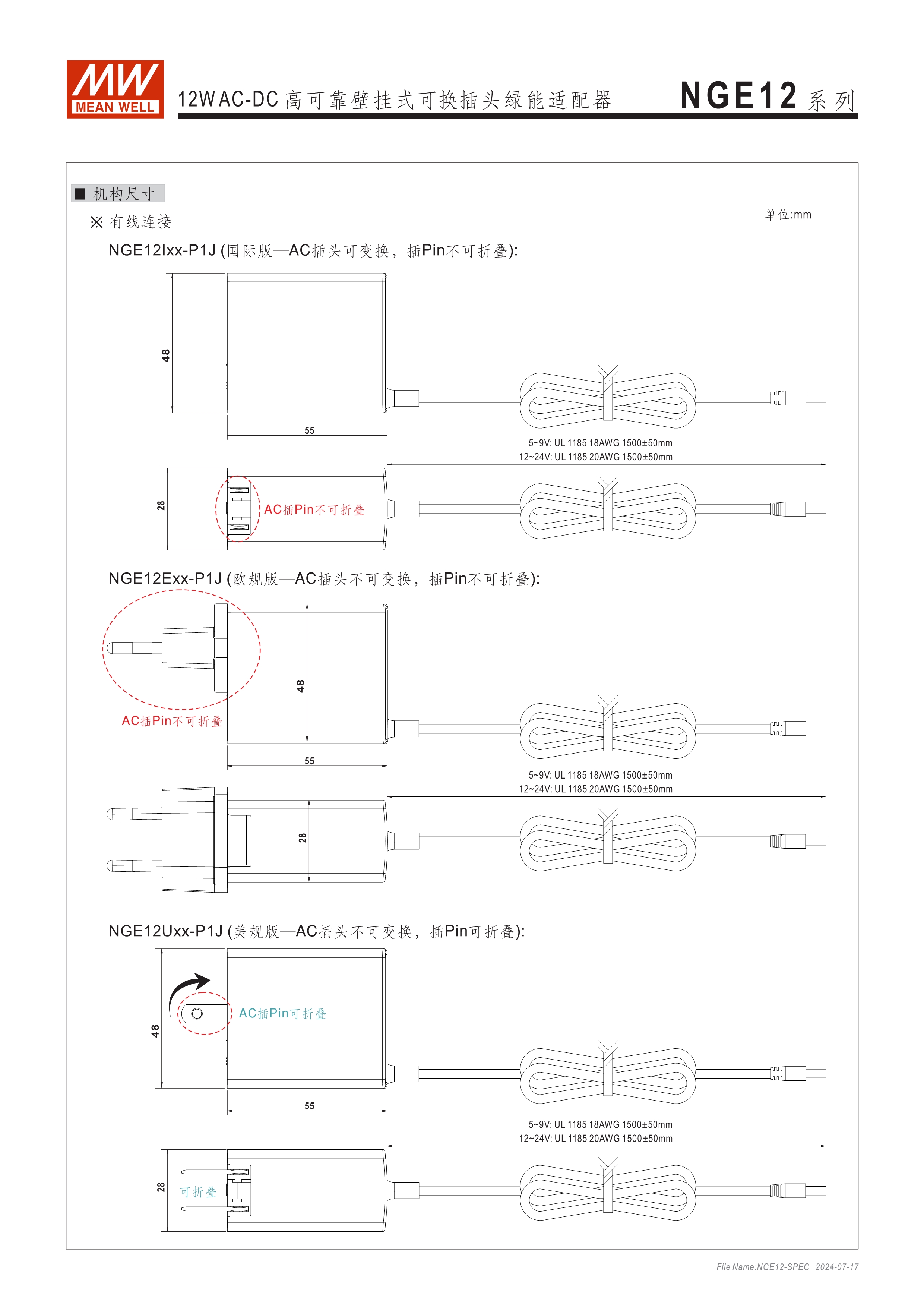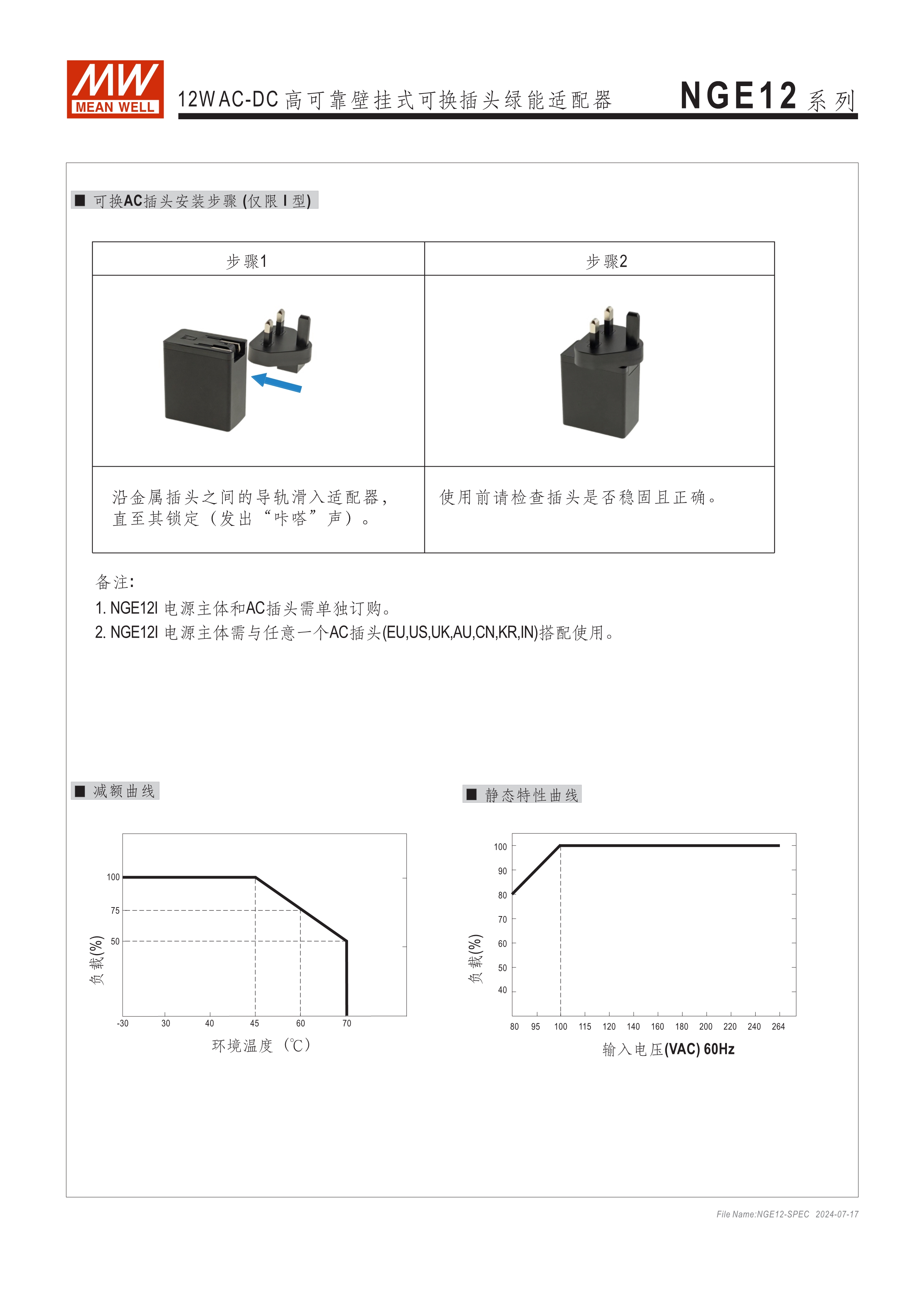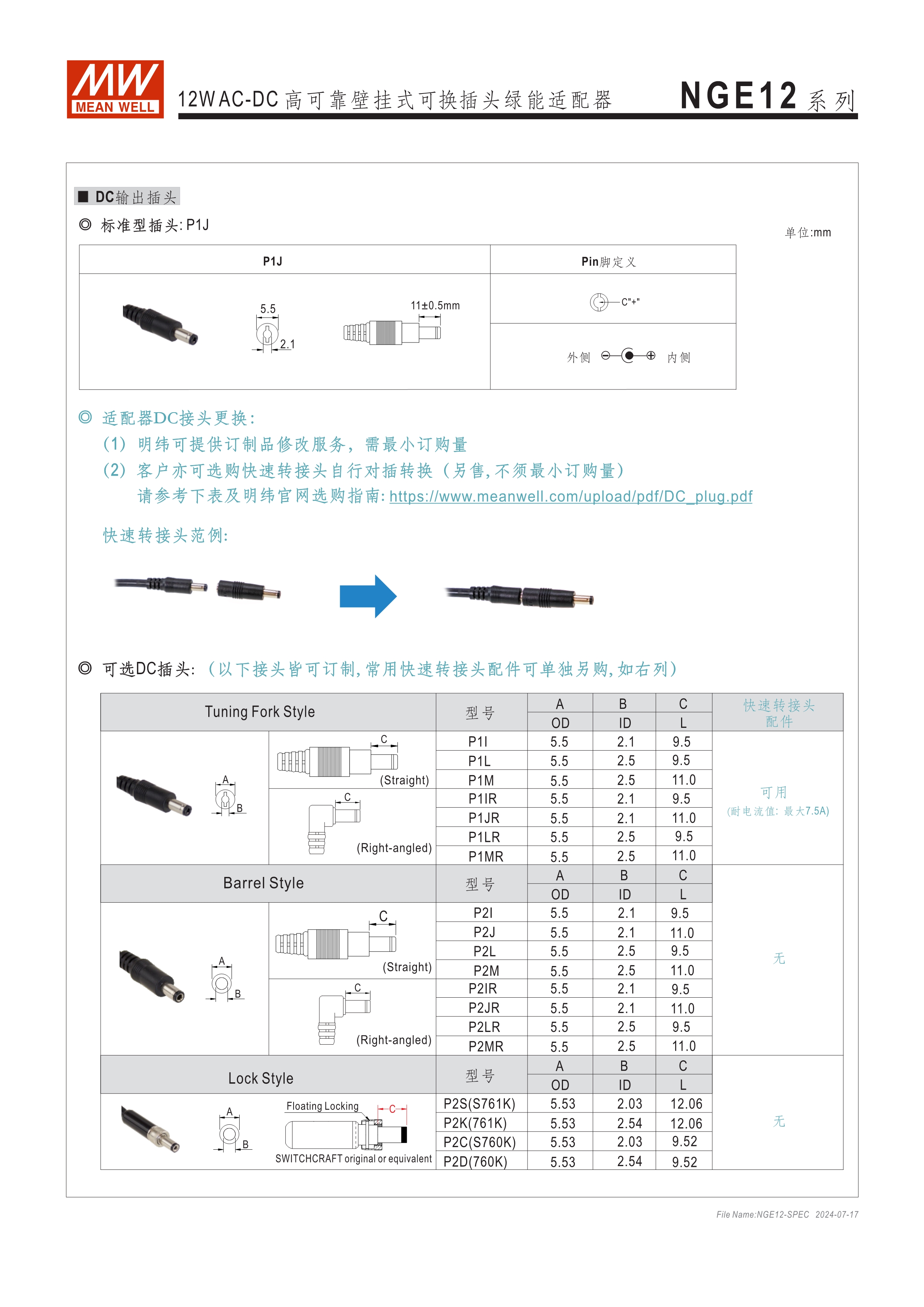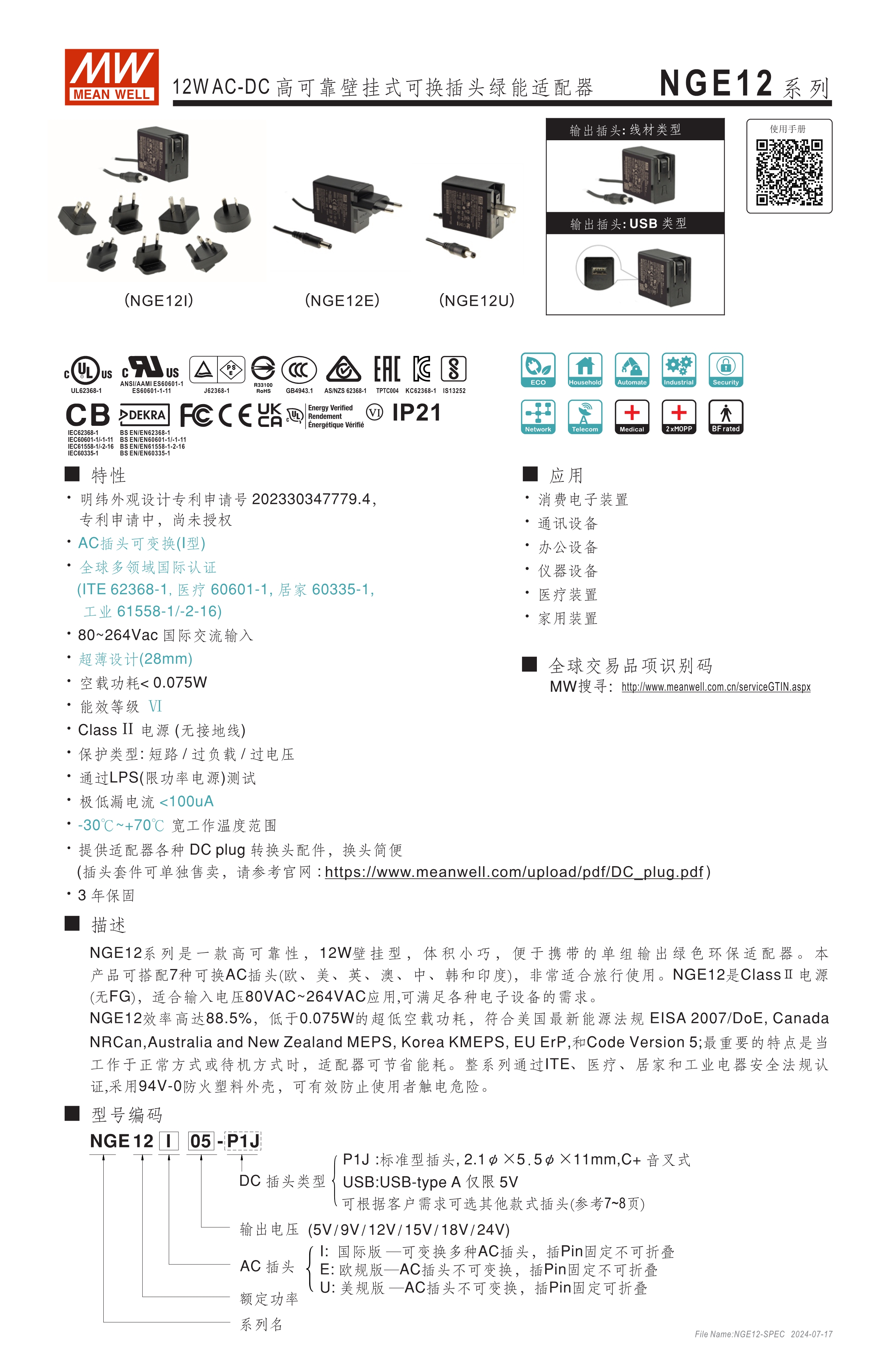 可換AC插頭 符合多領域全球認證 (信息類 62368-1、醫(yī)療 60601-1, 家用 60335-1、工業(yè) 61558-1/-2-16) 全范圍AC輸入 2xMOPP, BF應用 超窄面寬設計(28mm~30mm) 漏電流 <100uA 80~264V輸入 空載損耗<0.075W~0.1W 能效等級Level VII 保護功能:短路、過載、過電壓 漏電流 <100uA -30~70℃寬工作溫度 多種DC輸出轉(zhuǎn)接頭可更換 3年保固期
