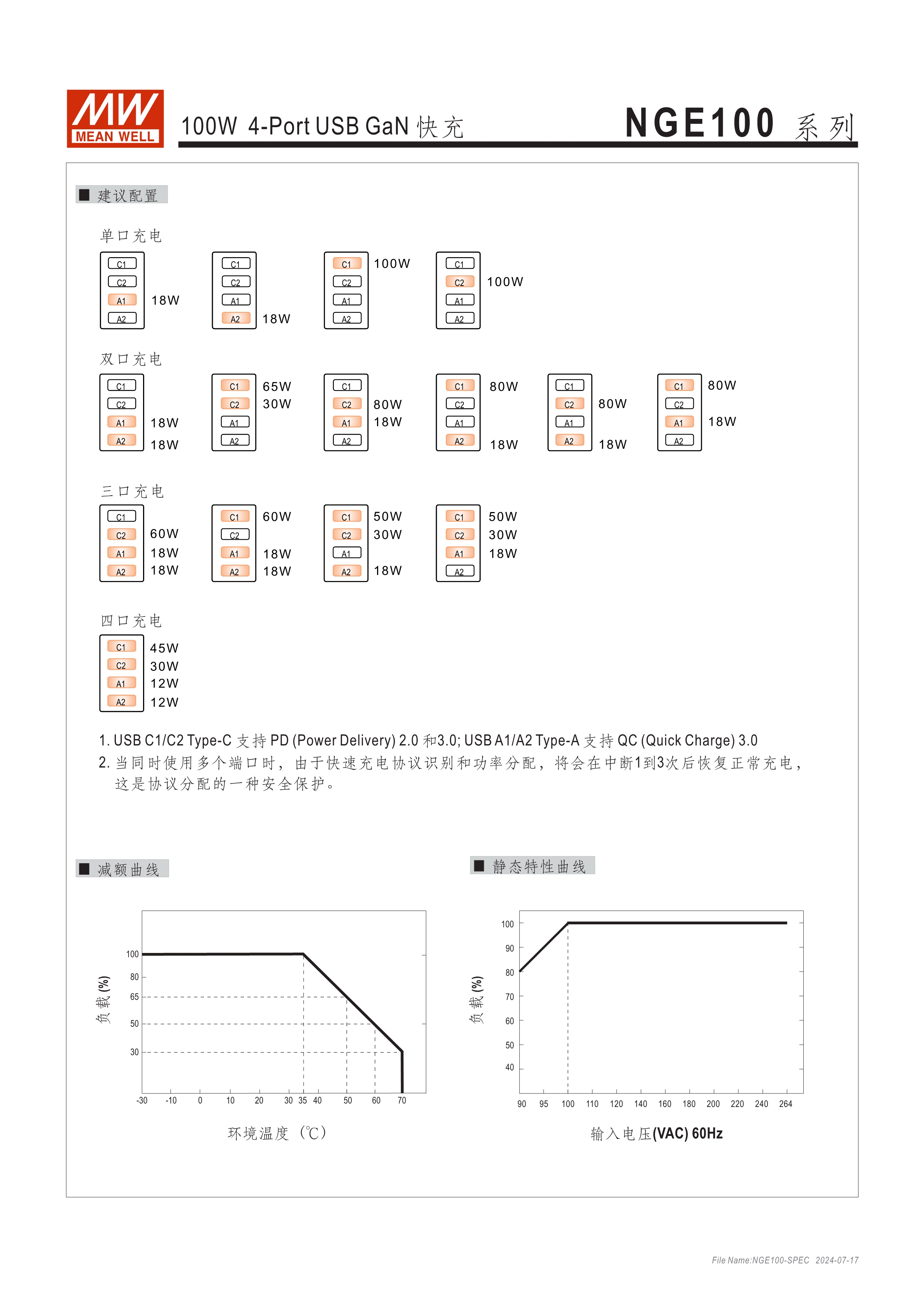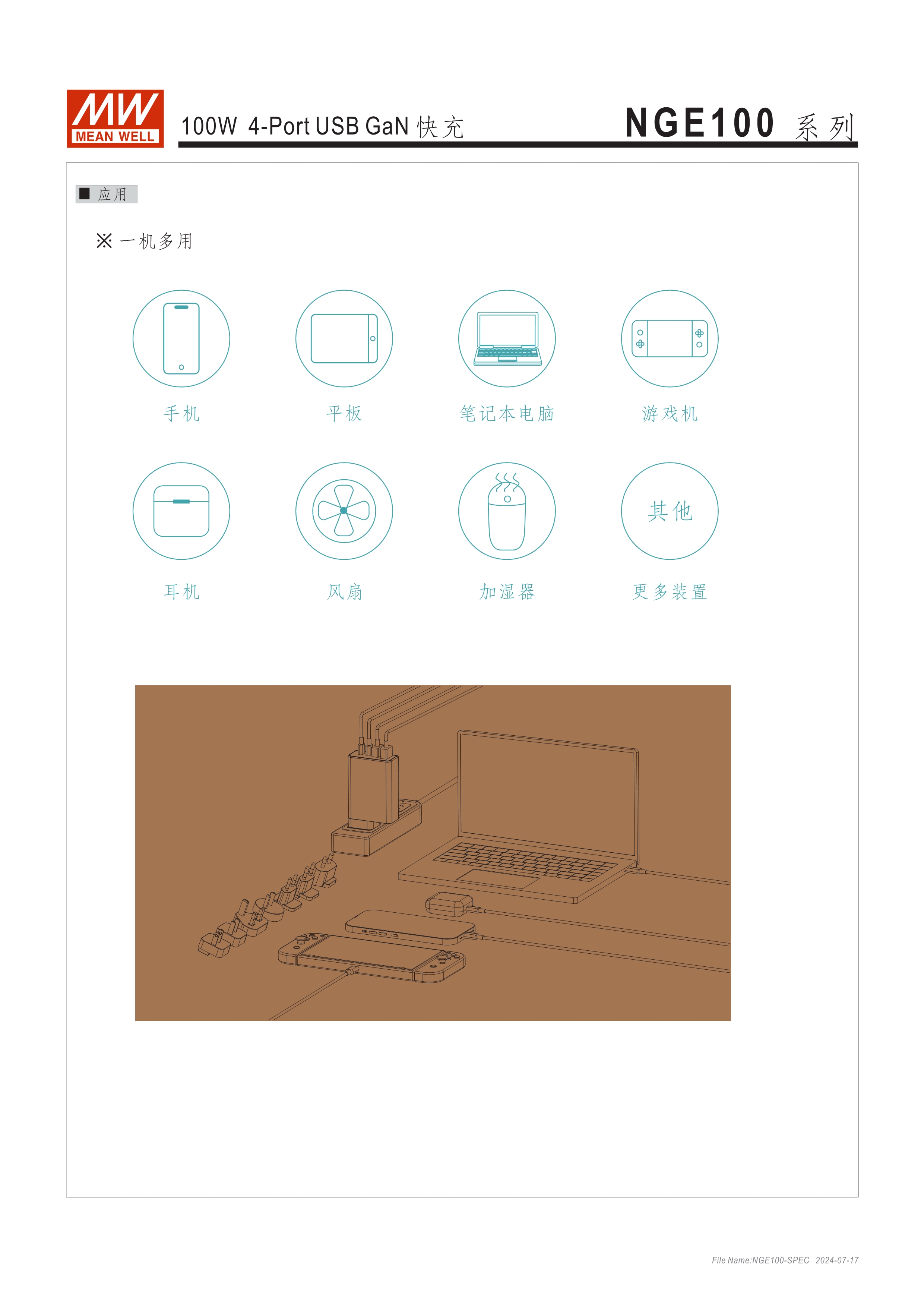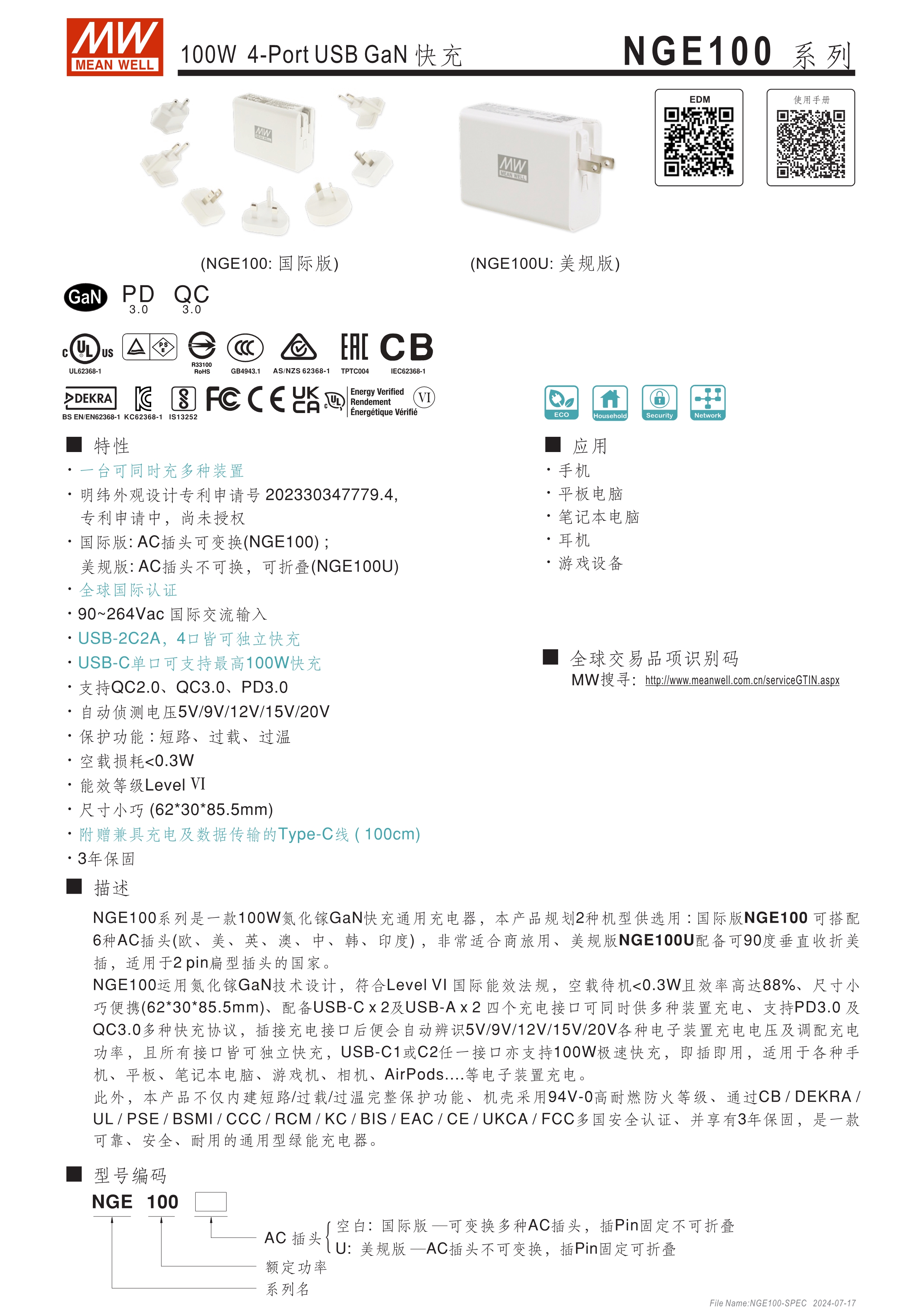 一臺可同時充多種裝置 國際版: AC插頭可變換(NGE100); 美規(guī)版: AC插頭不可換,可折疊(NGE100U) 全球國際認(rèn)證 USB-2C2A,4-Port皆可獨(dú)立快充 USB-C單port可支援最高100W快充 支援QC2.0、QC3.0、PD3.0 自動偵測電壓:5V/ 9V/ 12V/ 15V/ 20V 保護(hù)功能 : 短路、過載、過溫 空載損耗<0.3W 能效等級Level VI 尺寸小巧 (62x 30x 85.5mm) 附贈兼具充電及資料傳輸?shù)腡ype-C線 (100cm) 3年保固