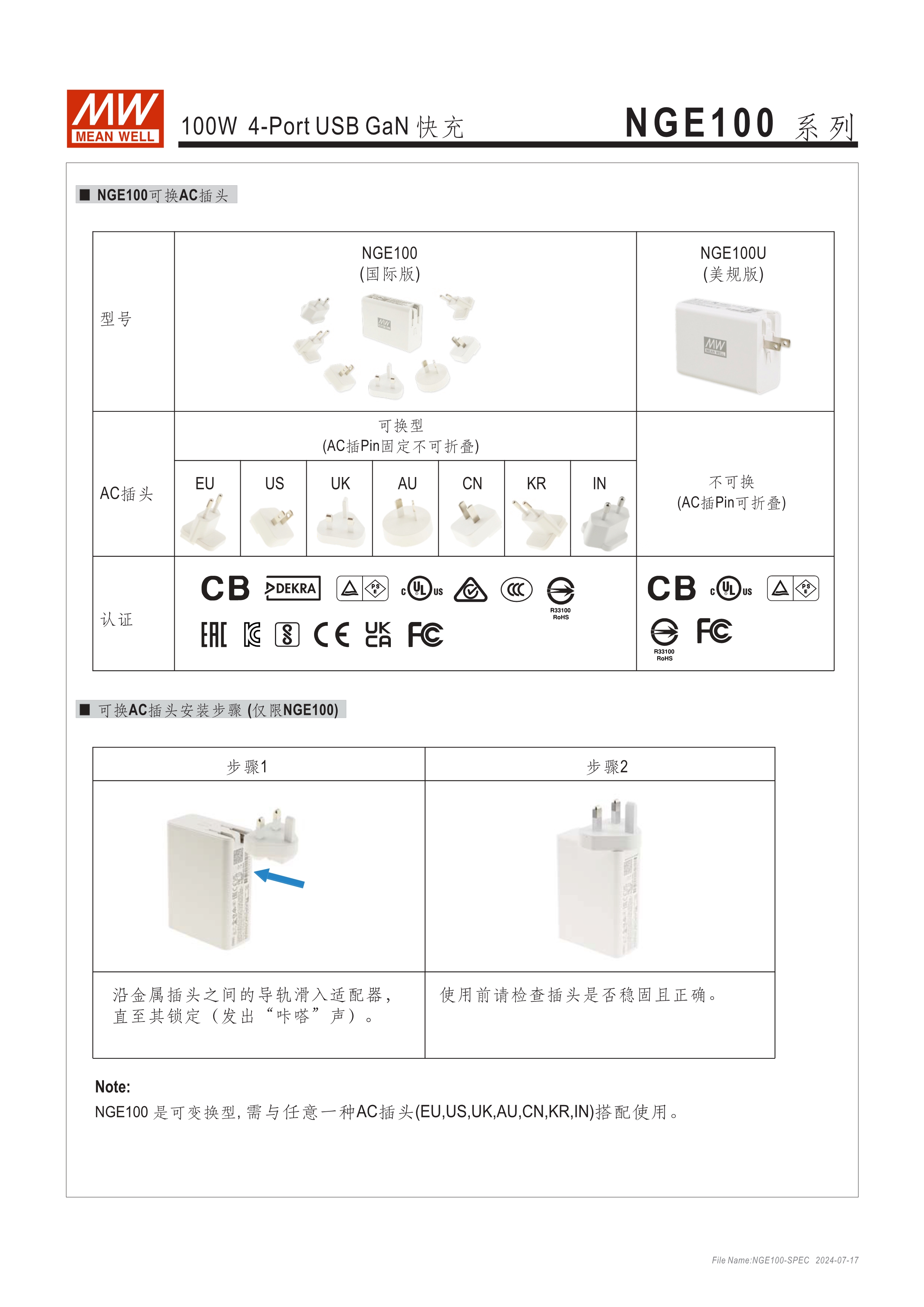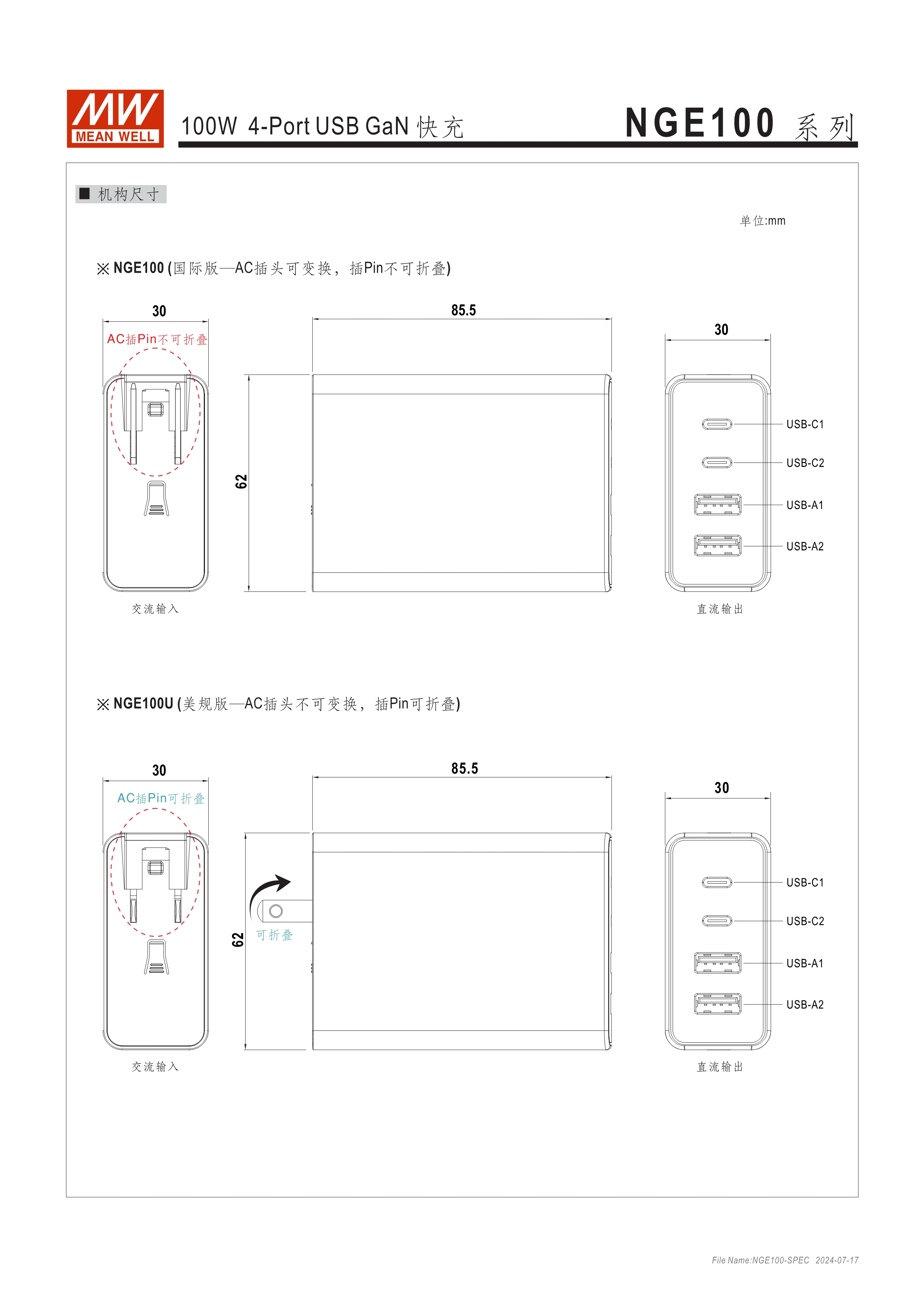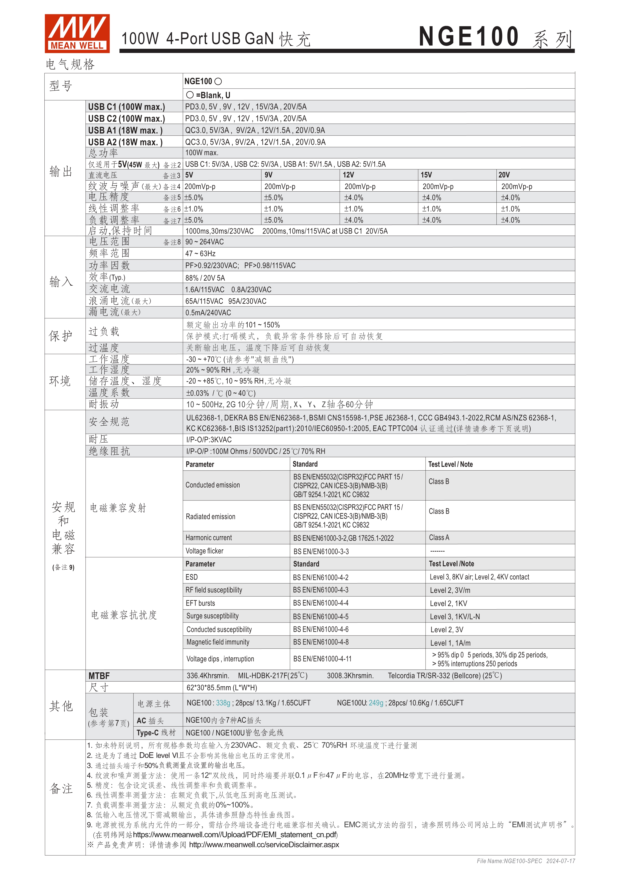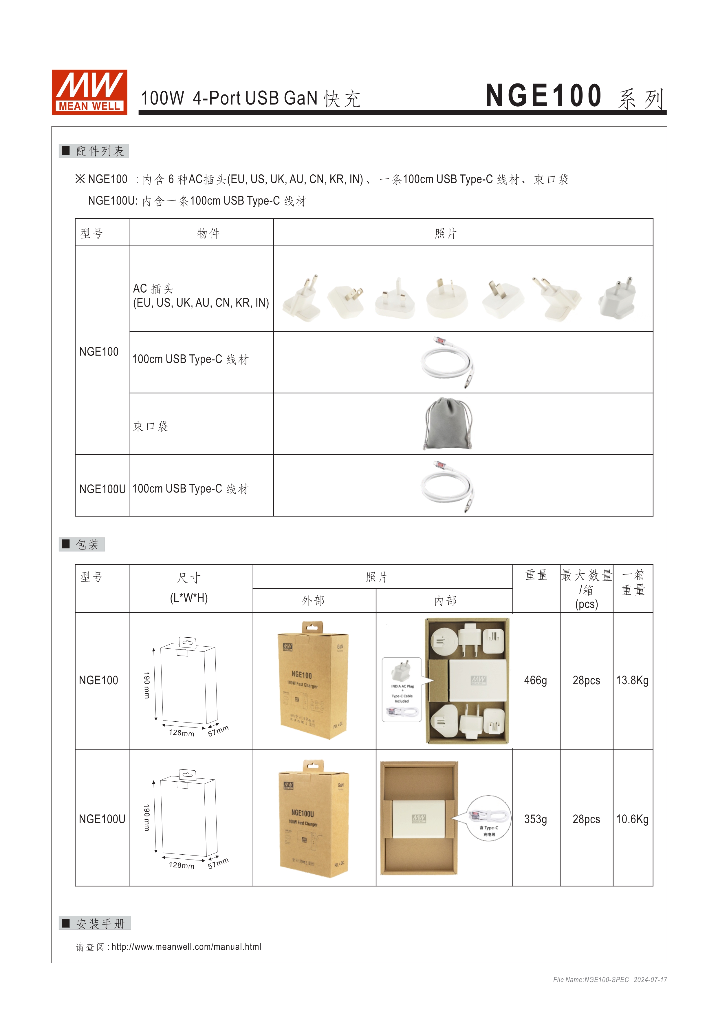 一臺可同時充多種裝置 國際版: AC插頭可變換(NGE100); 美規(guī)版: AC插頭不可換,可折疊(NGE100U) 全球國際認(rèn)證 USB-2C2A,4-Port皆可獨(dú)立快充 USB-C單port可支援最高100W快充 支援QC2.0、QC3.0、PD3.0 自動偵測電壓:5V/ 9V/ 12V/ 15V/ 20V 保護(hù)功能 : 短路、過載、過溫 空載損耗<0.3W 能效等級Level VI 尺寸小巧 (62x 30x 85.5mm) 附贈兼具充電及資料傳輸?shù)腡ype-C線 (100cm) 3年保固