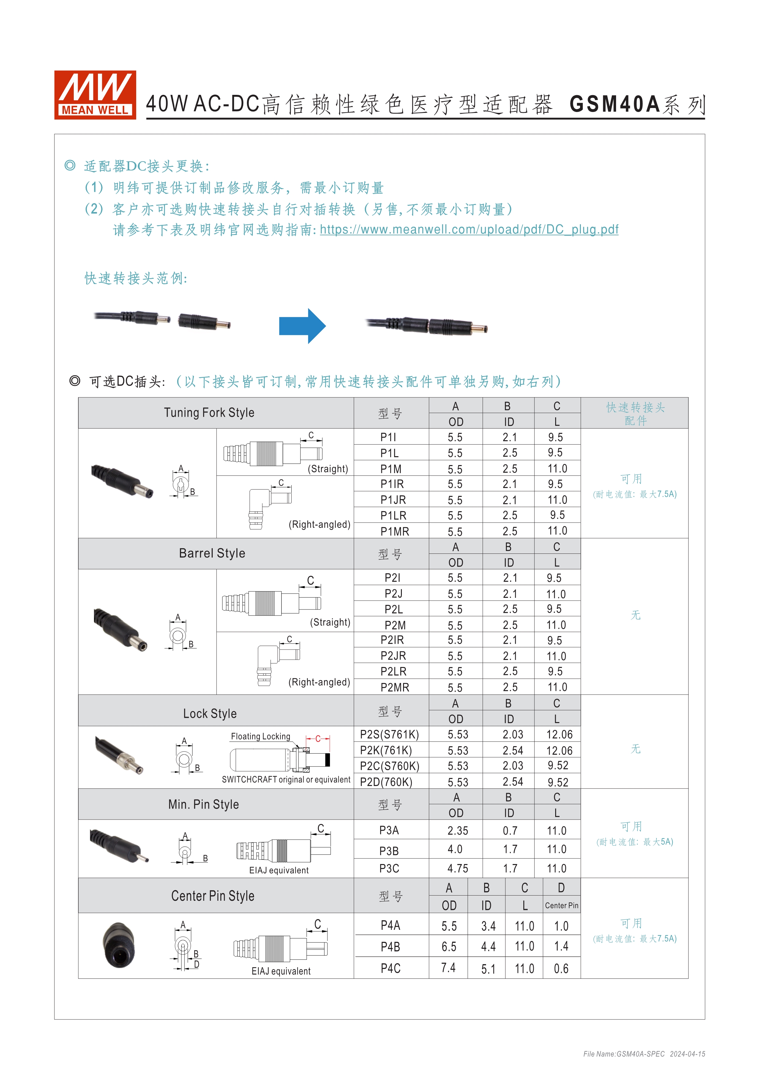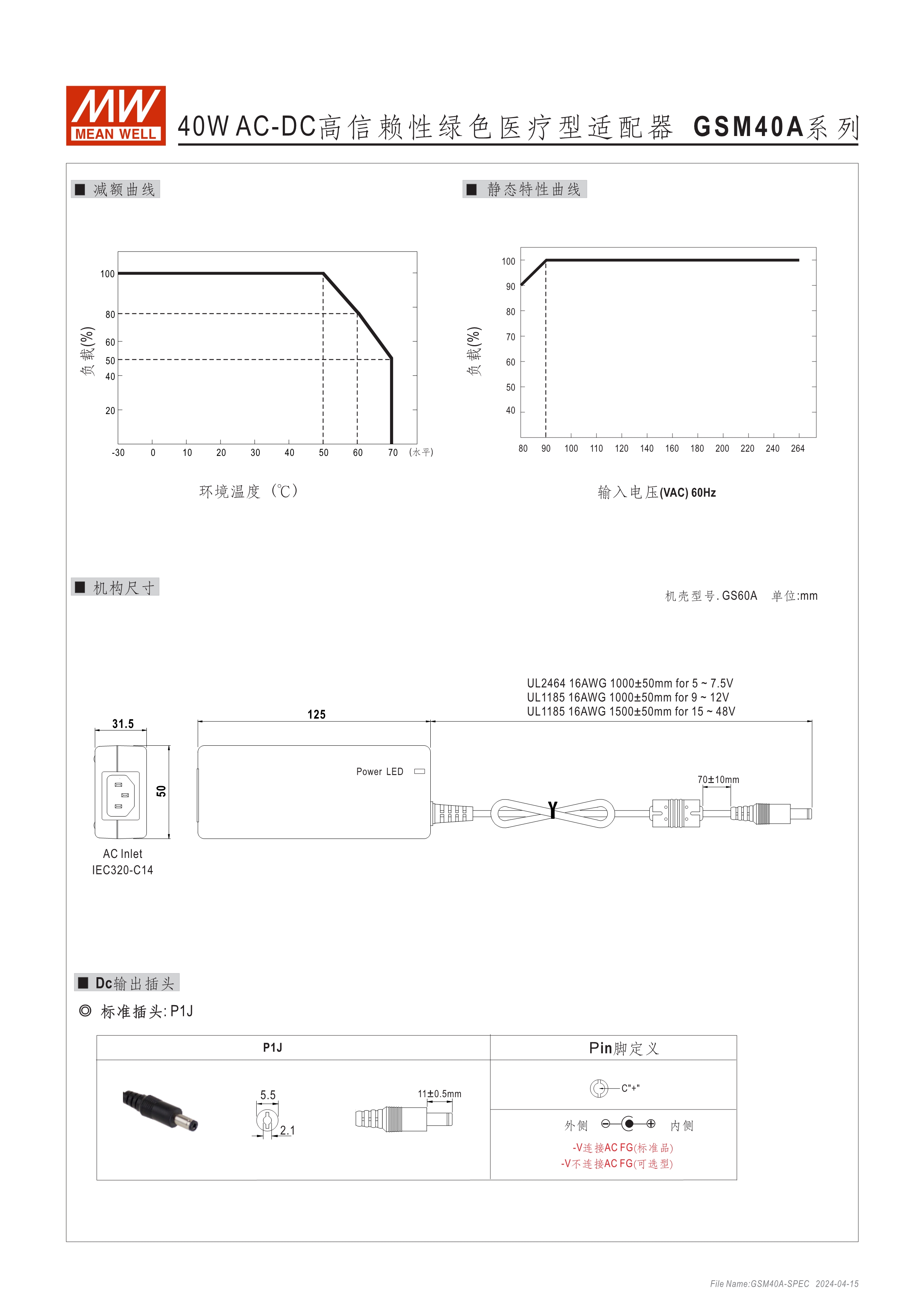 通過醫(yī)療60601-1認(rèn)證(2xMOPP),BF應(yīng)用(僅B型) 能效 VI 級(jí) 空載損耗<0.1W~0.15W 符合EISA/DoE、NRCan、ErP 及CoC Version 5 A型:Class I 電源(有接地PIN),IEC 320-C14接口 B型:Class II 電源(無接地PIN),IEC 320-C8接口 極端漏電流<50~175uA(依型號(hào)) -30~+70℃工作溫度 多種DC輸出轉(zhuǎn)接頭可更換 3年保固
