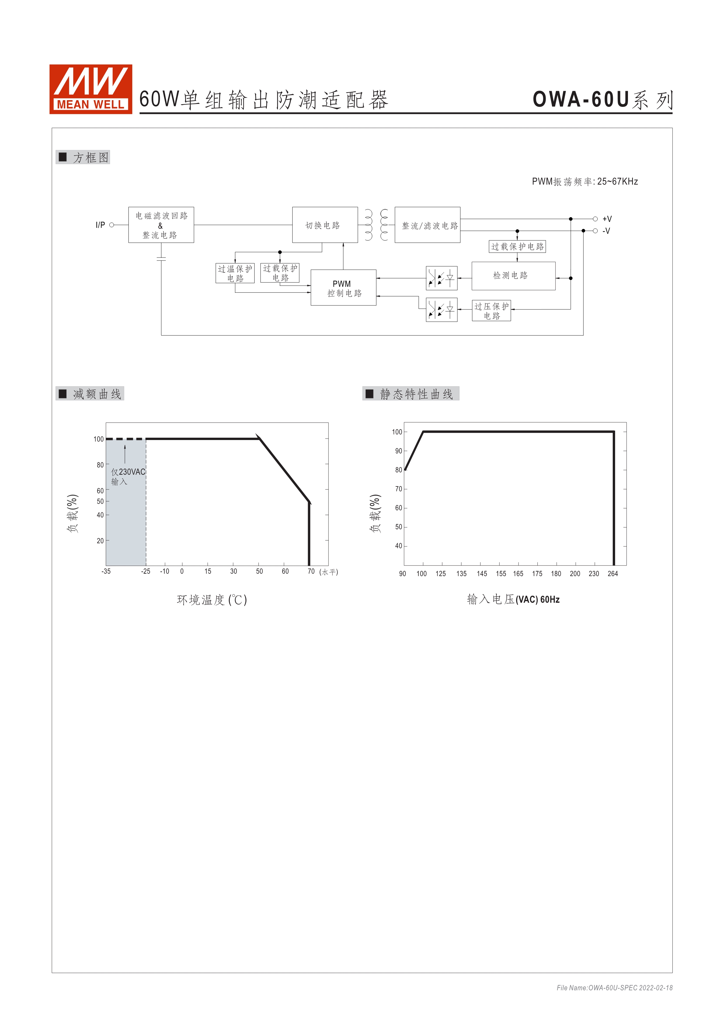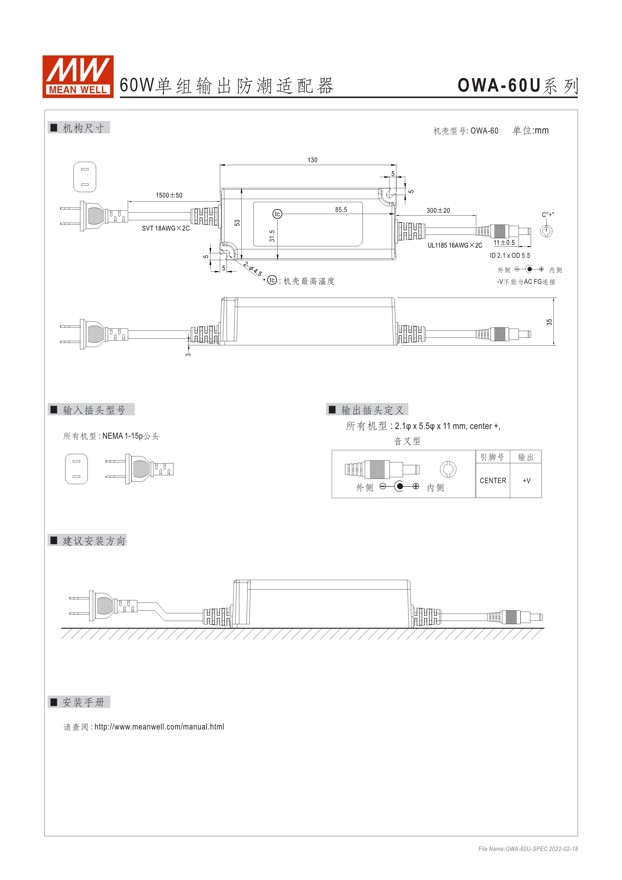 電源主體達IP67防護等級 90~264VAC交流輸入(OWA-120E為180~264VAC交流輸入) 空載損耗<0.15W 能效等級Level VI E型: 符合EU ErP 及 CoC Version 5 (OWA-120E 僅符合EU ErP) U型: 符合EISA 2007/DoE 及 NRCan Class II電源 (無FG) U型:2極美插,E型:2極歐插 多種DC輸出轉(zhuǎn)接頭可更換 5年保固期