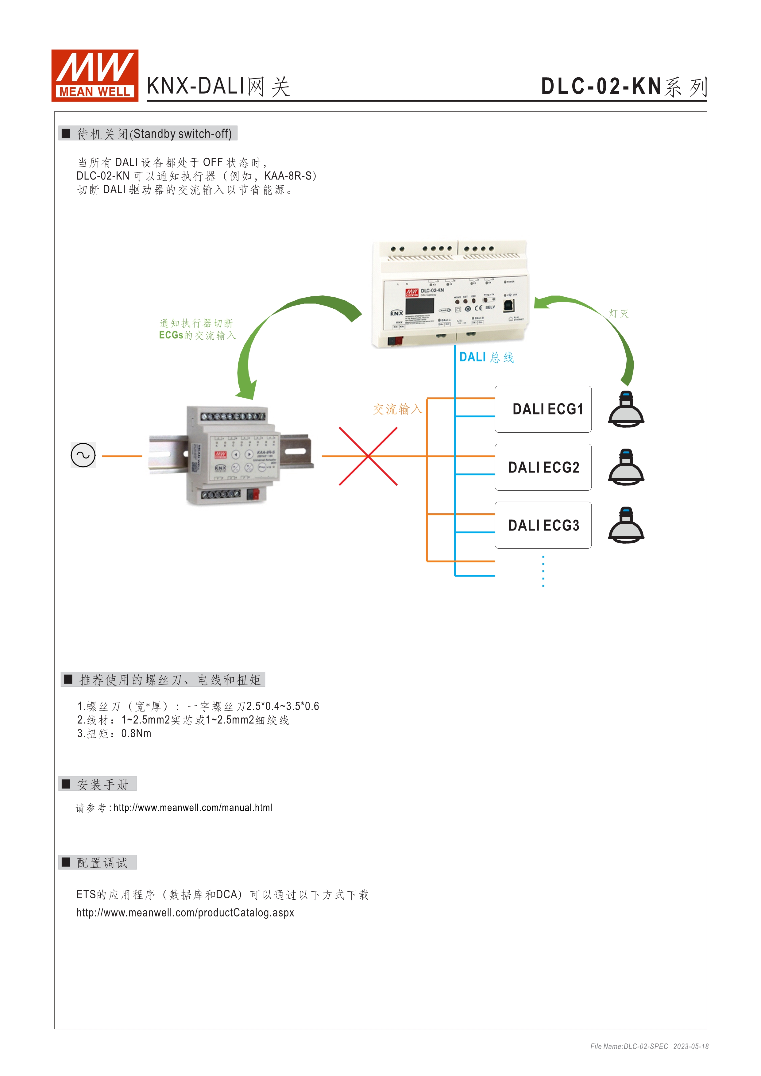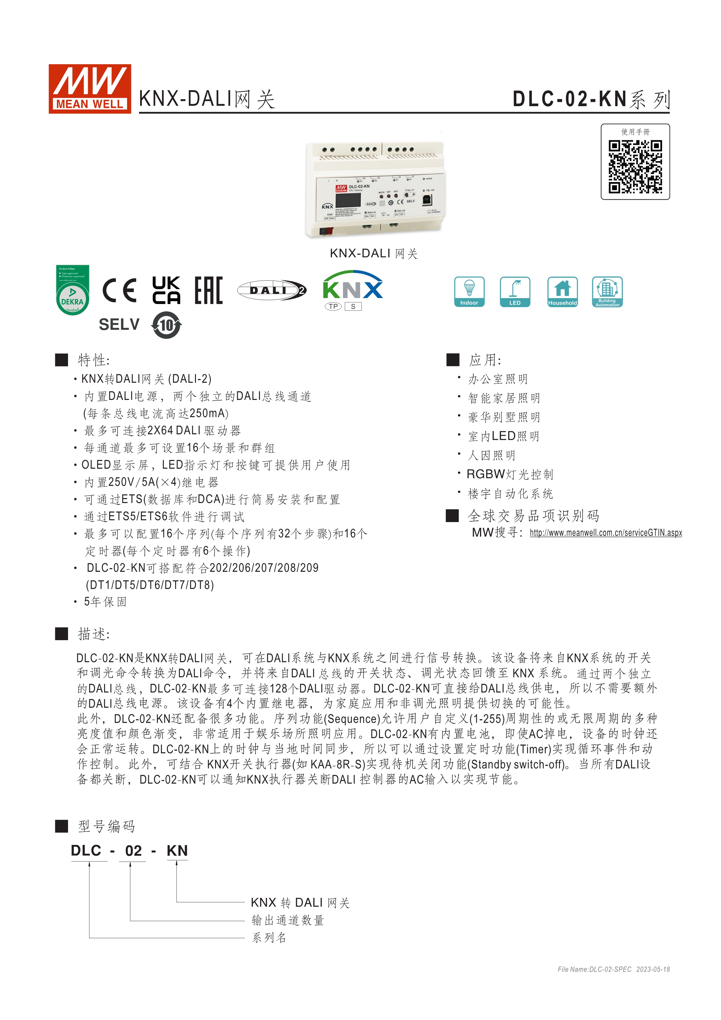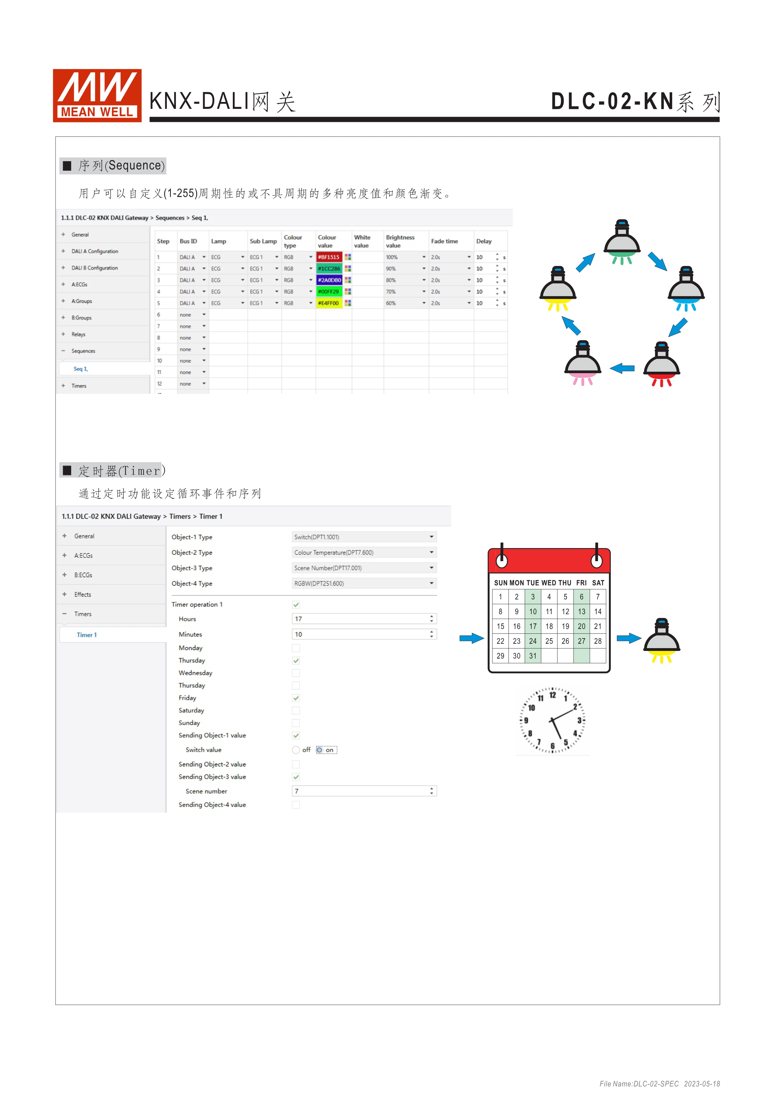符合IEC 62386 DALI-2,Part 101/103/207/208標(biāo)準(zhǔn) 2組獨(dú)立DALI總線,可接Control Gear及Control Device搭配使用 4路可控繼電器,接觸容量5A,可當(dāng)電器開關(guān)或兩組電動(dòng)窗簾使用 可搭配DLC軟體做現(xiàn)場(chǎng)系統(tǒng)設(shè)定,或透過網(wǎng)路線從遠(yuǎn)端做修改設(shè)定 透過本體液晶顯示螢?zāi)患安倏匕粹o,可做簡(jiǎn)單設(shè)定和狀態(tài)查詢 內(nèi)建Timer晶片,可搭配DLC軟體做行程控制設(shè)定 通訊介面接口:RJ-45及KNX,可與其他樓宇自動(dòng)化系統(tǒng)做連線擴(kuò)充使用 采導(dǎo)軌式設(shè)計(jì),體積小巧僅8SU寬度(144x 90x 58.4mm)