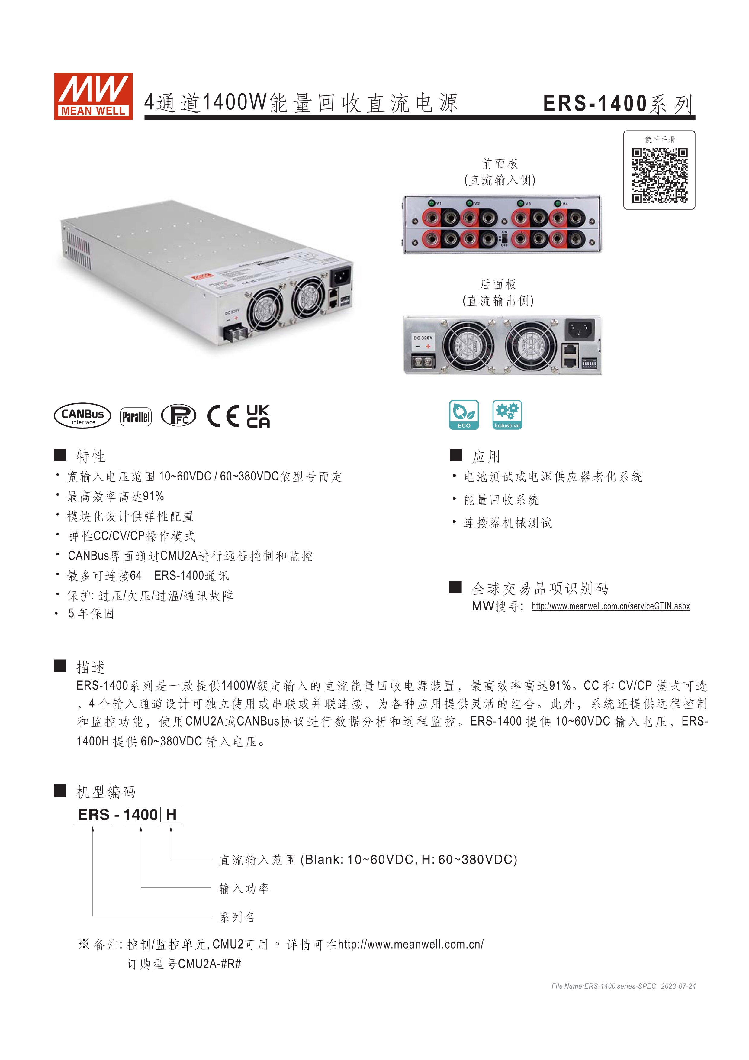 寬輸入電壓范圍10~60VDC/60~380VDC(視機(jī)型而定) 效率高達(dá)91% 靈活配置的模塊化設(shè)計(jì) 彈性的CC/CV/CP操作模式 通過CMU2A實(shí)現(xiàn)CAN總線協(xié)議遠(yuǎn)程控制和監(jiān)控控制 可連接最多64臺(tái)ERS-1400系列 保護(hù)功能: 過電壓、欠電壓、過熱、通信錯(cuò)誤 3年保固期