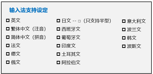 | 軟件功能 | 多語輸入 | ||||