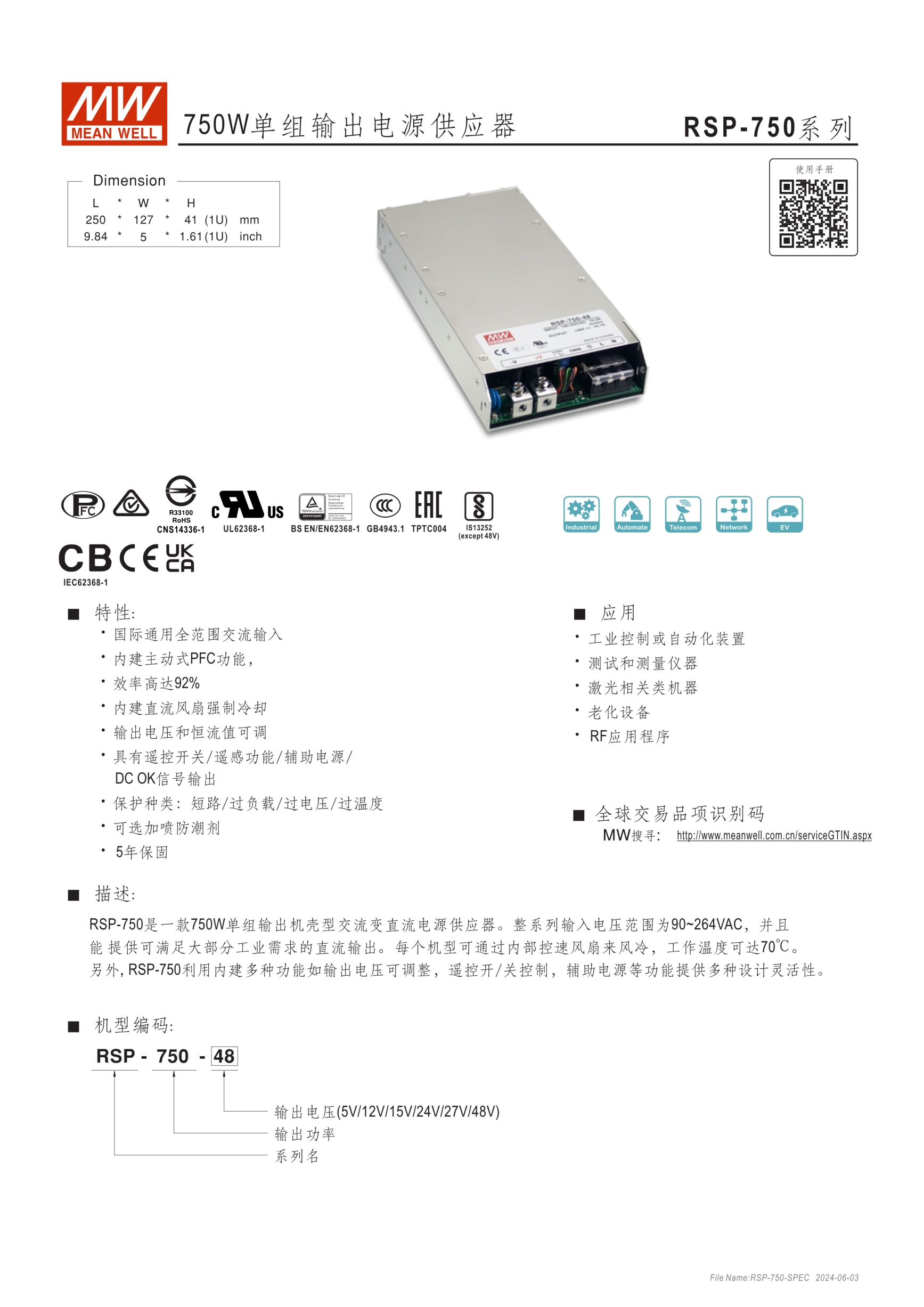 內(nèi)建主動式功率因子矯正功能(active PFC) 輸出電壓可程序 輸出電流(Icc)可程序 (RSP-750/1600 only) RSP-750/1000/1600/2000為1U(41mm)低高度設(shè)計,(RSP-1500/2400/3000為2U) 內(nèi)建主動式并聯(lián)功能(除RSP-750) 5年保固期