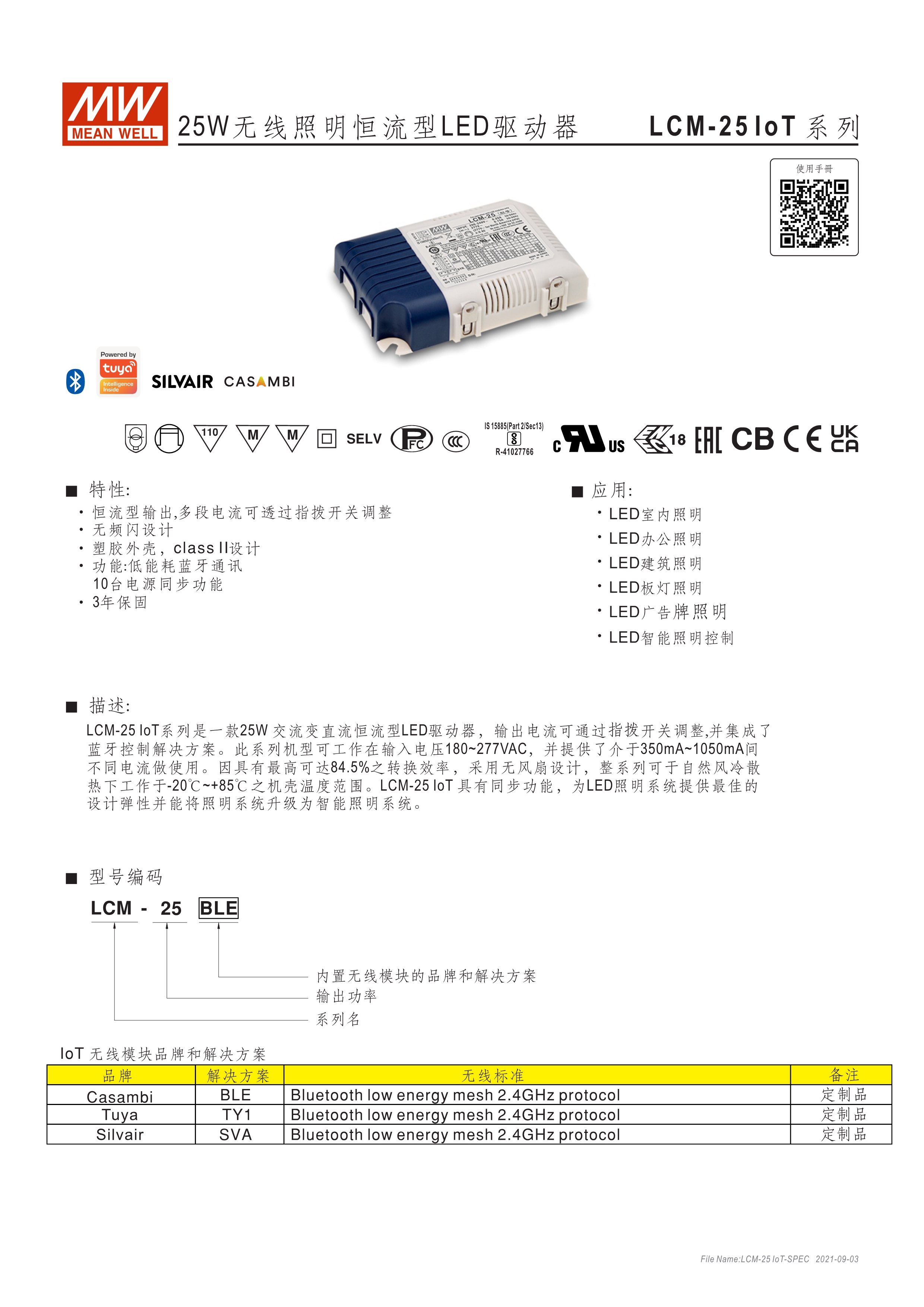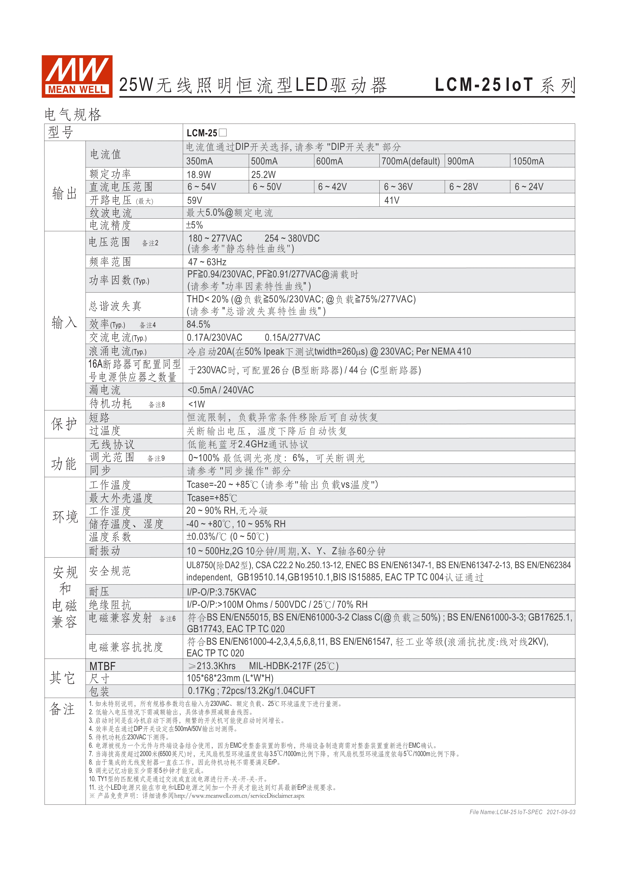 恒流輸出模式多段可選 無頻閃設(shè)計(jì) 塑料外殼及符合Class II無地線設(shè)計(jì) 主動(dòng)式PFC設(shè)計(jì) 調(diào)光功能:全系列藍(lán)芽智能控制及Push Dim(僅LCM系列) 雷擊保護(hù)耐壓設(shè)計(jì)2KV(L-N) 保護(hù)功能:短路、過電壓、過溫度