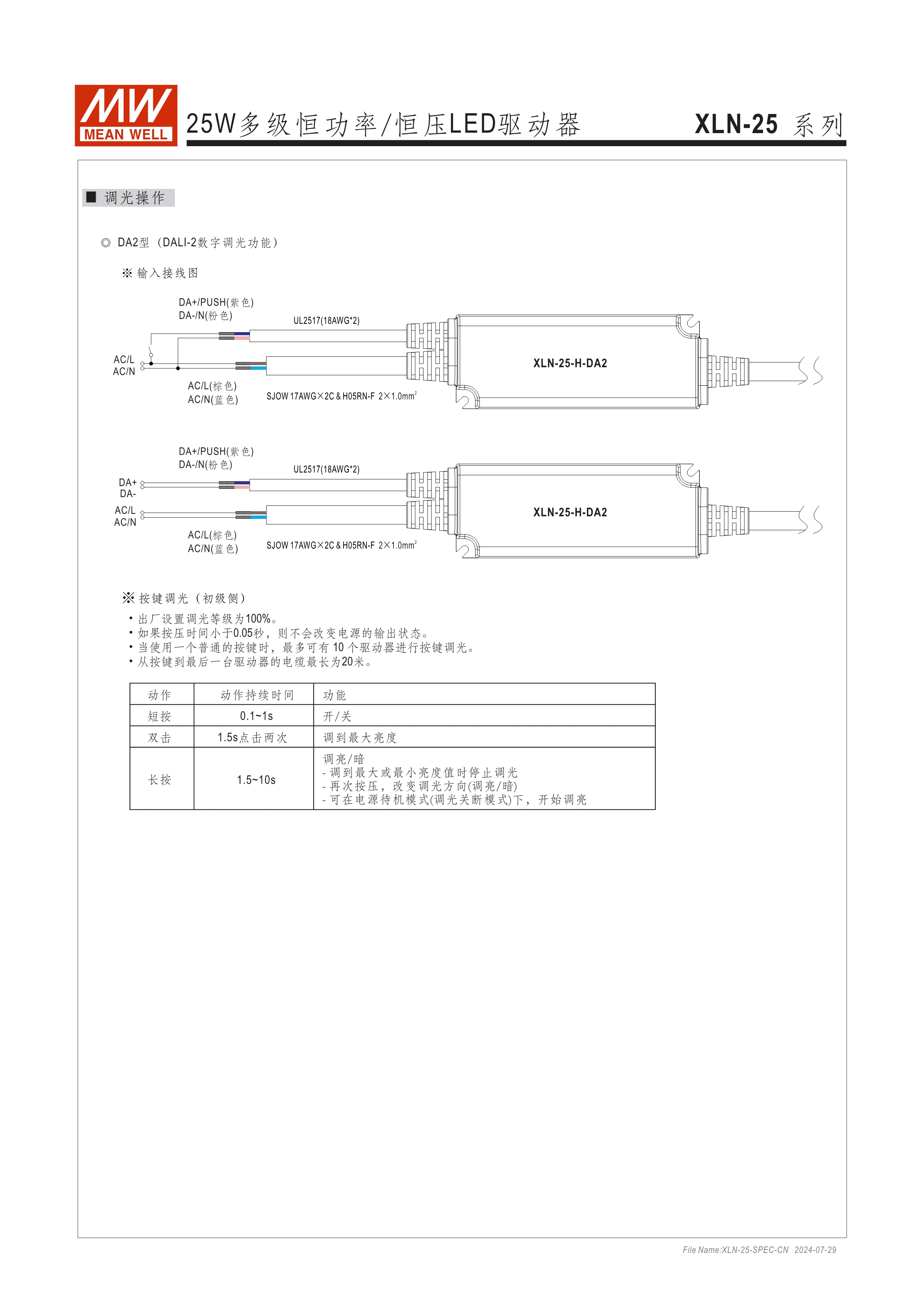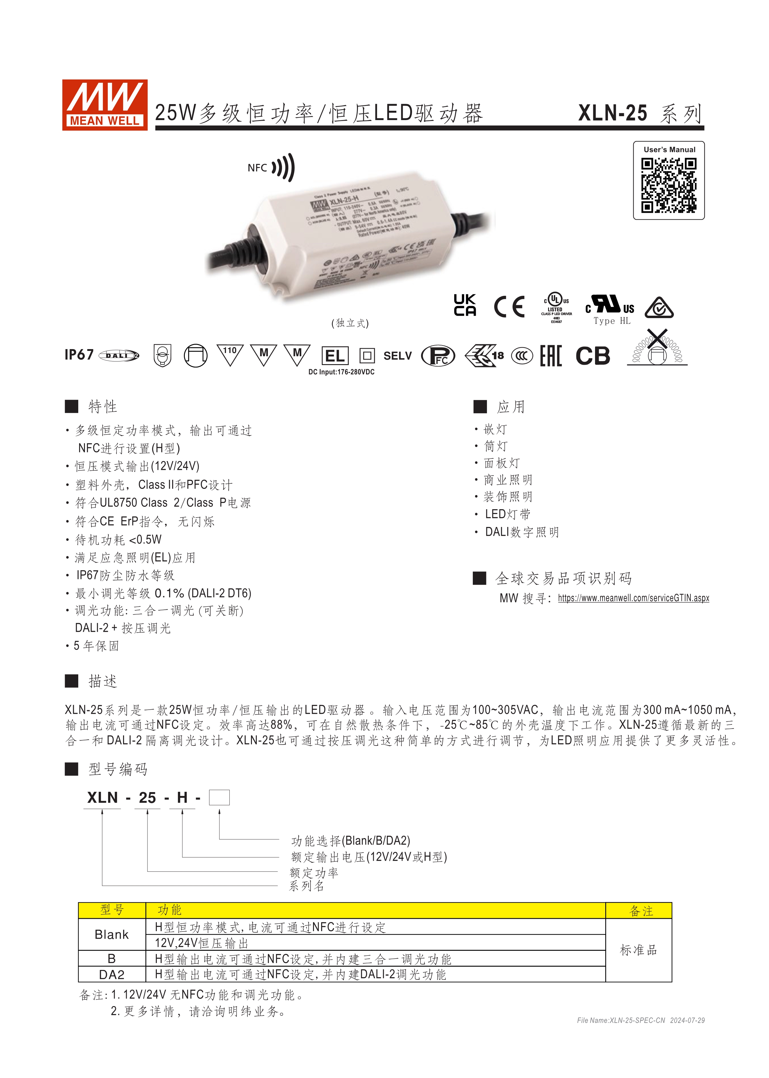 恒功率設計可寬范圍調整輸出電流(H型) 恒壓輸出機型可選12V/24V/48V NFC感應調整輸出電流(出線式) 全電壓輸入110~305V AC 具PFC功能 塑膠殼雙重絕緣及Class II/2設計 符合IEEE 1789及Erp無頻閃標準 待機功耗<0.5W 最低調光亮度<0.1% (DALI-2 DT6) 全灌封膠設計符合IP67防水防塵 符合應急照明(EL)功能 調光功能:三合一、DALI-2:KNX、IoT(選配) 輸出與調光線路間符合隔離設計 獨立型或內置型LED驅動電源可選 5年保固及>50,000 hrs壽命