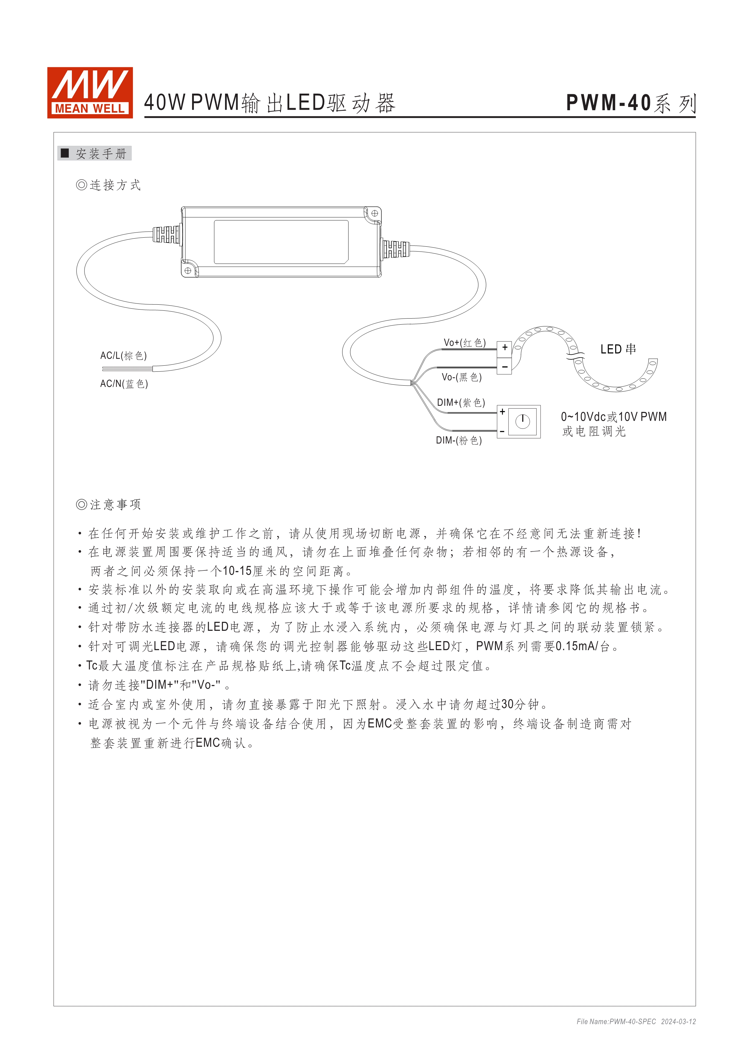 90~305VAC交流輸入, 內(nèi)建主動式功率因子矯正功能(active PFC) 塑料外殼,IP67防護等級 恒壓PWM輸出 Class II設(shè)計,無FG 空載待機消耗瓦數(shù)<0.5W 內(nèi)建三合一調(diào)光功能(0~10VDC, PWM信號或電阻,可關(guān)斷) 5年保固期