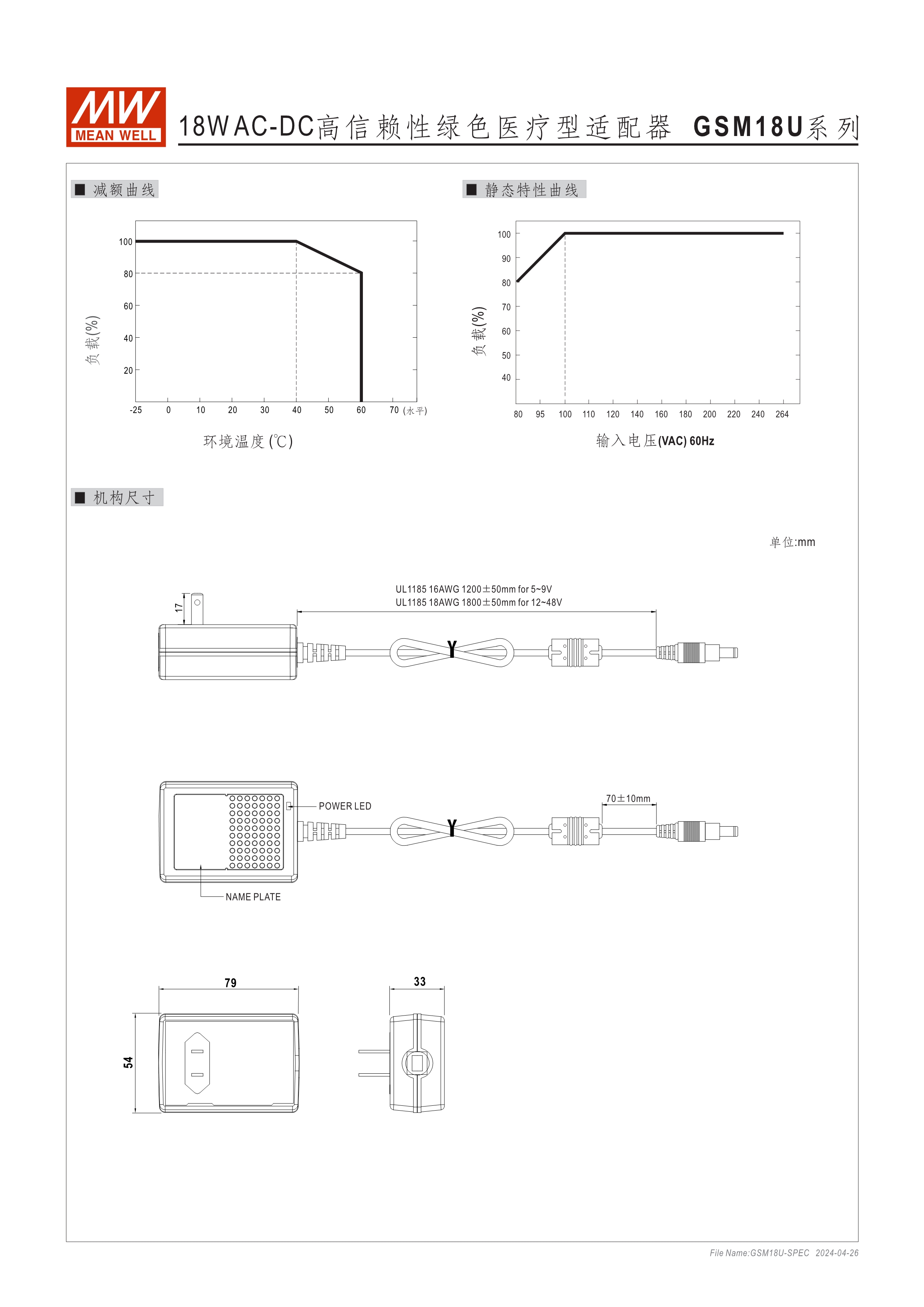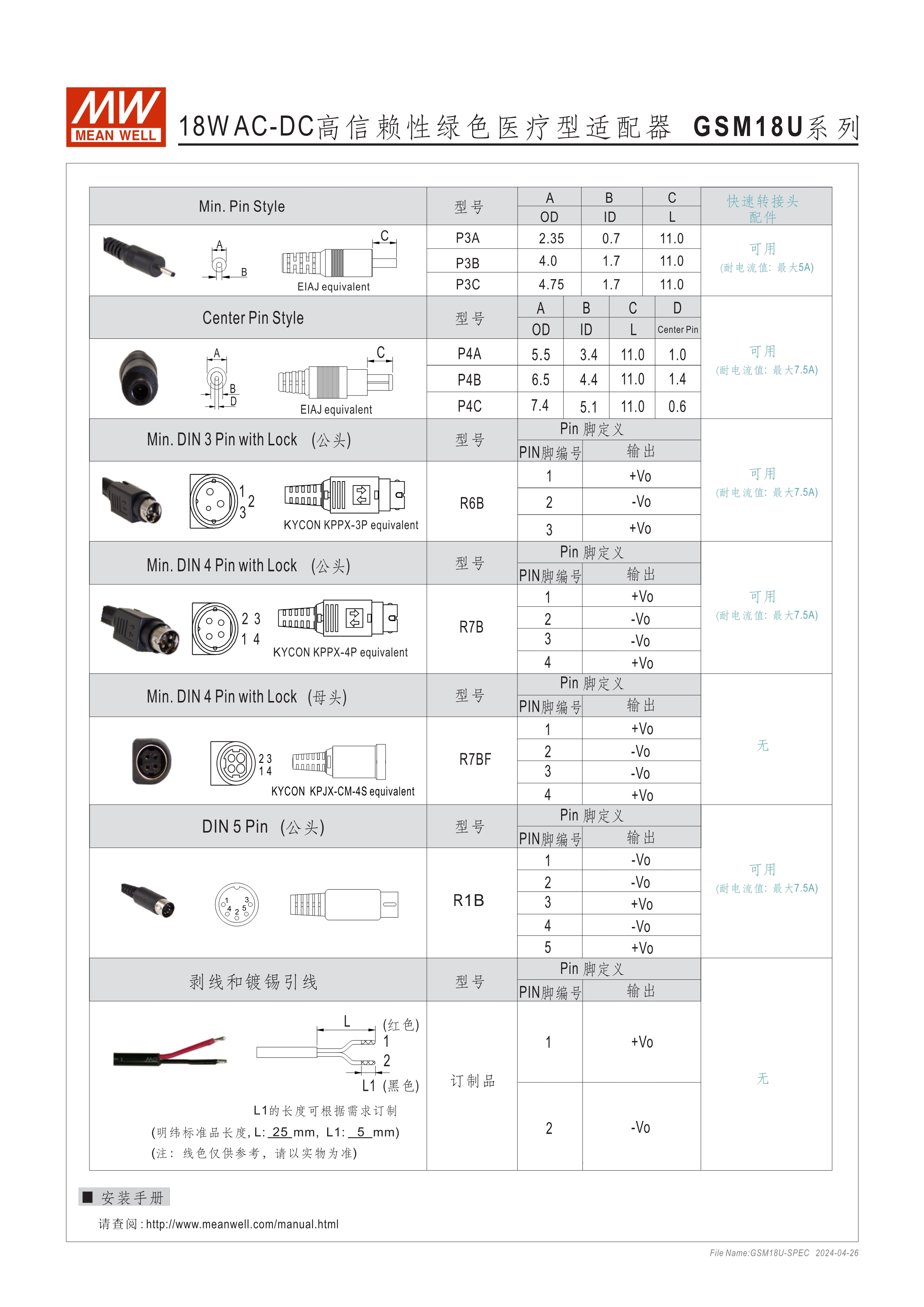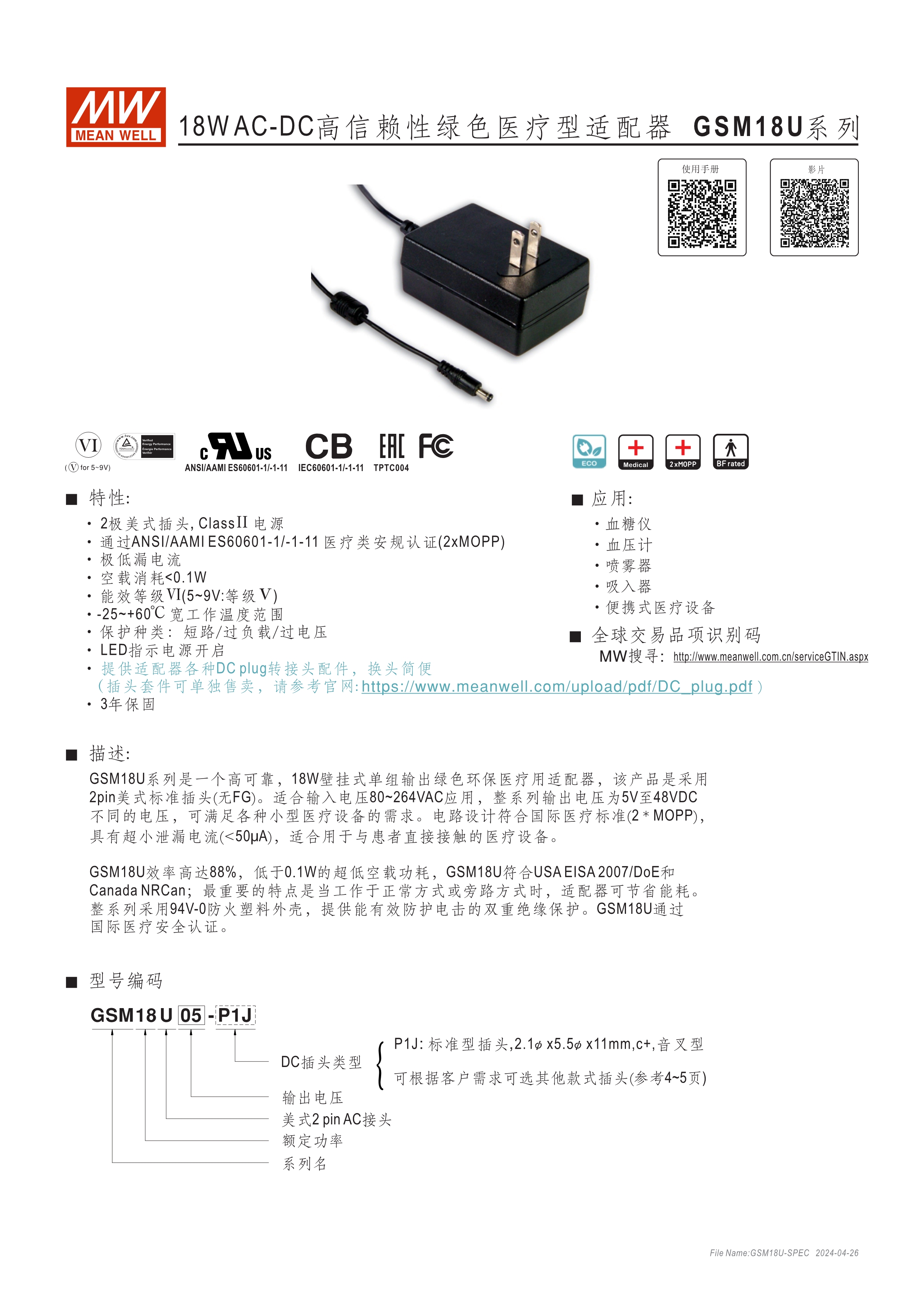 通過醫(yī)療60601-1/-11認證(2xMOPP),BF 應用 80~264Vac輸入 空載損耗<0.075W~0.3W 能效等級Level VI(GSM06/12和GSM18/25/36 5~9V為Level V) 2極美插(U型)/ 歐插(E型) 極端漏電流<50~100uA(依型號) 多種DC輸出轉接頭可更換 3年保固