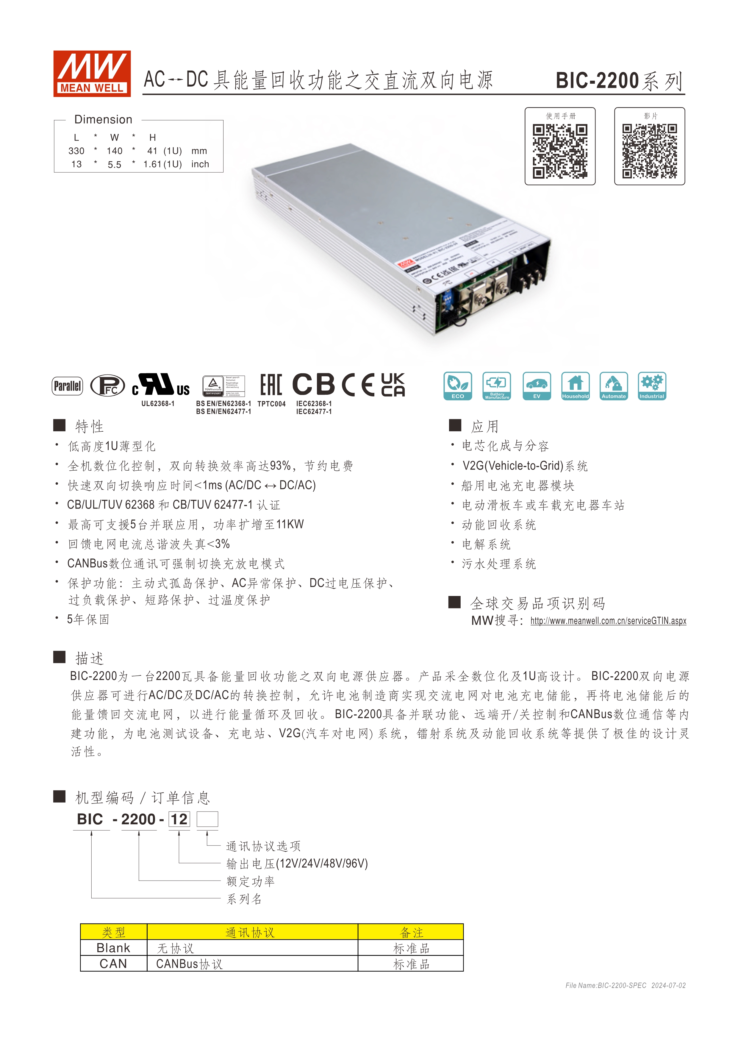 系統(tǒng)電源解決方案 (PDF) 低高度1U薄型化設(shè)計(jì) 全機(jī)數(shù)字化控制,雙向轉(zhuǎn)換效率高達(dá)93% 快速雙向切換響應(yīng)時(shí)間<1ms (AC/DC ? DC/AC) CB/UL/TUV 62368法規(guī)認(rèn)證,電路設(shè)計(jì)符合IEC 62477法規(guī) 最高可支持5臺(tái)并聯(lián)應(yīng)用,功率擴(kuò)增至11kW 回饋電網(wǎng)電流總諧波失真<3% 數(shù)字通訊可強(qiáng)制切換充放電模式(選配CANBus機(jī)型) 保護(hù)功能:主動(dòng)式孤島保護(hù)、AC異常保護(hù)、DC過電壓保護(hù)、過負(fù)載保護(hù)、短路保護(hù)、過溫度保護(hù) 5年保固