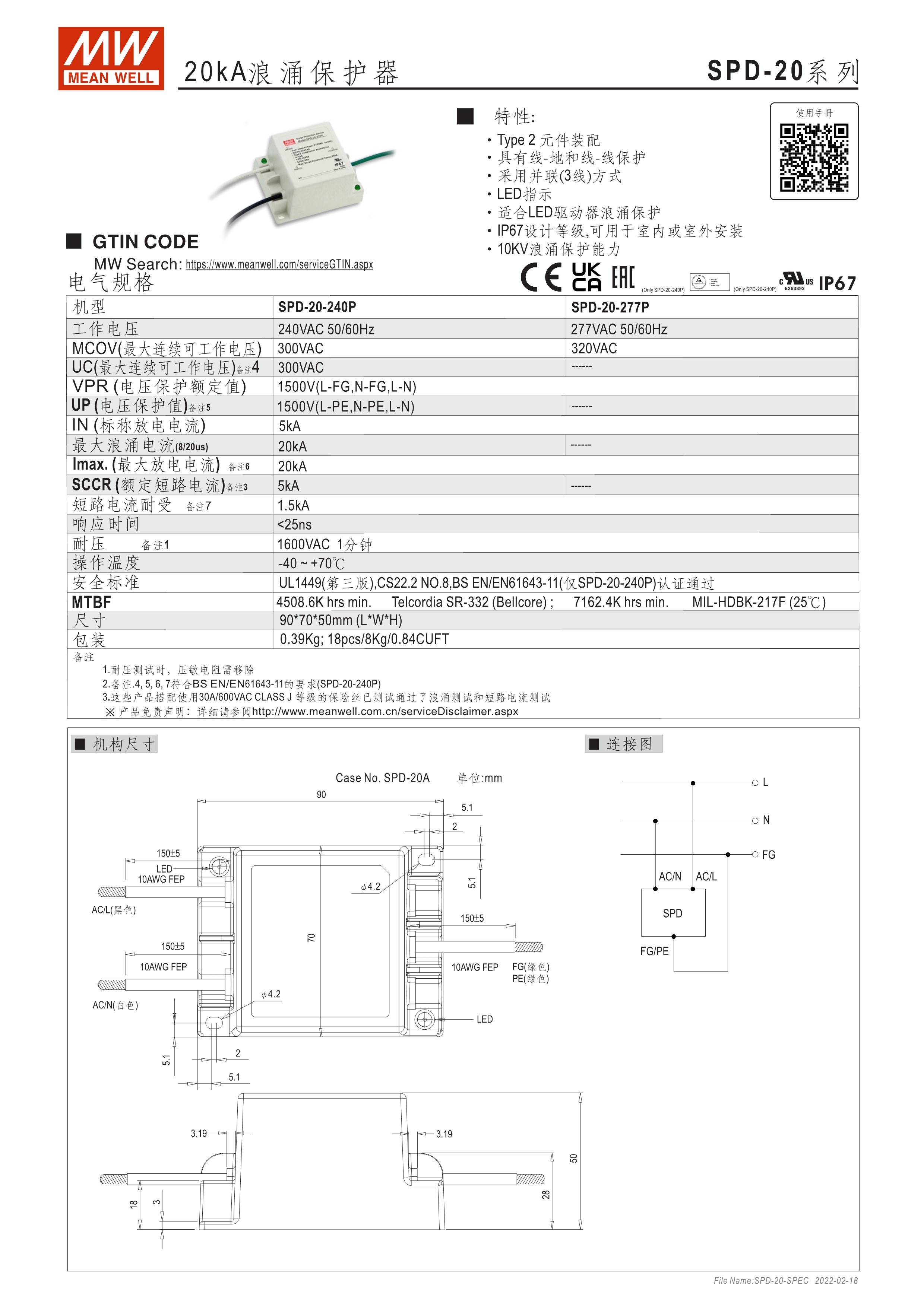 10kA/20kA雷擊突波保護器 線對地與線對線保護 適合于雷擊瞬間保護LED電源 IP66/67設(shè)計等級,適用于室內(nèi)或是室外安裝