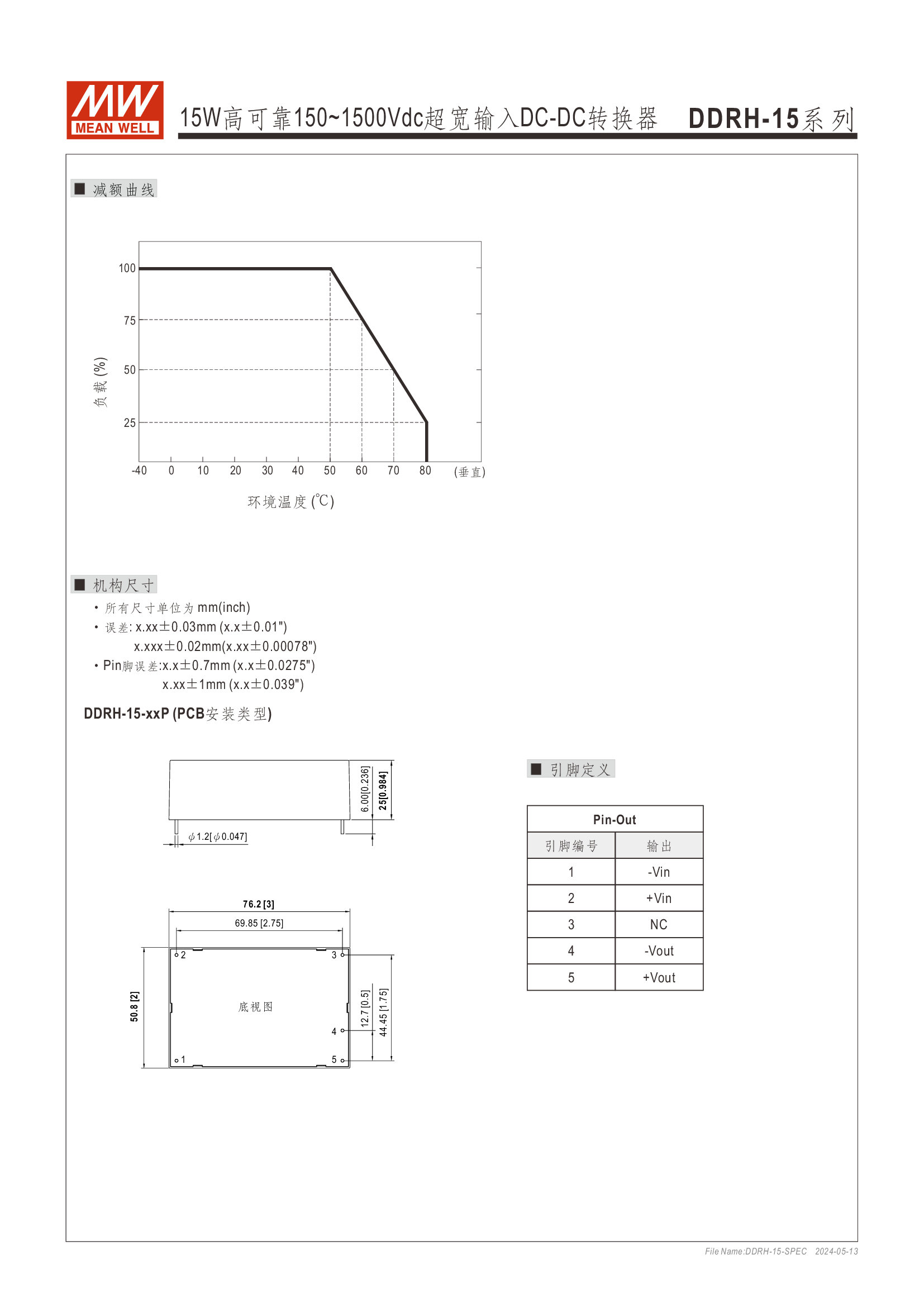多種安裝方式可供選擇(基板型、端子式和導軌式) 10:1 超寬輸入范圍 內(nèi)部灌膠,提供防塵和防潮保護 超寬溫度范圍:-40℃~+80℃ 保護功能:短路保護、超載保護、過電壓保護、輸入電壓過低及極性反接保護 3年保固